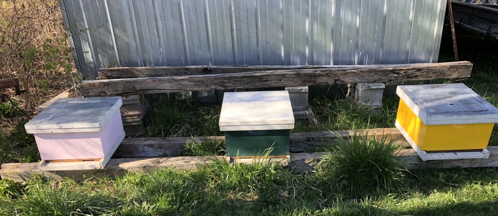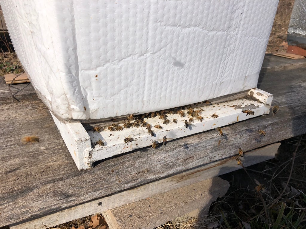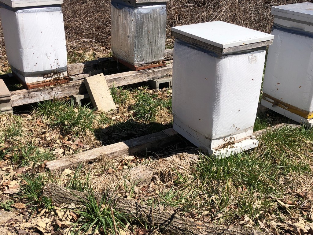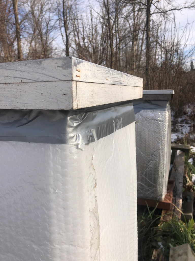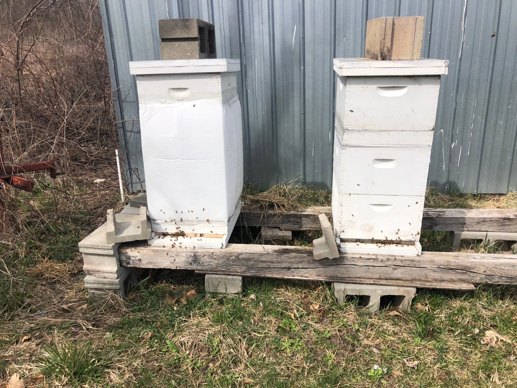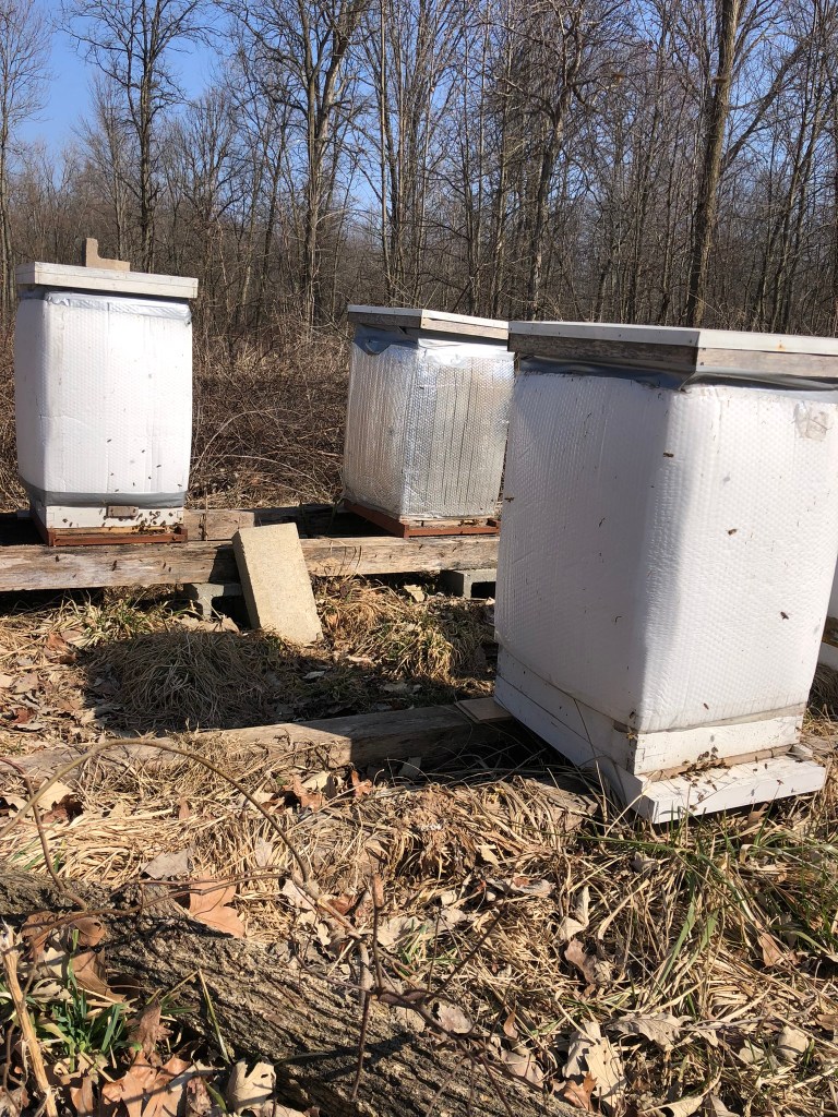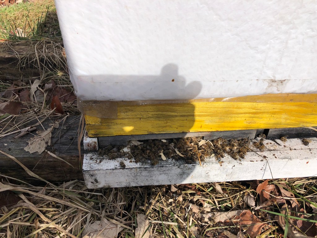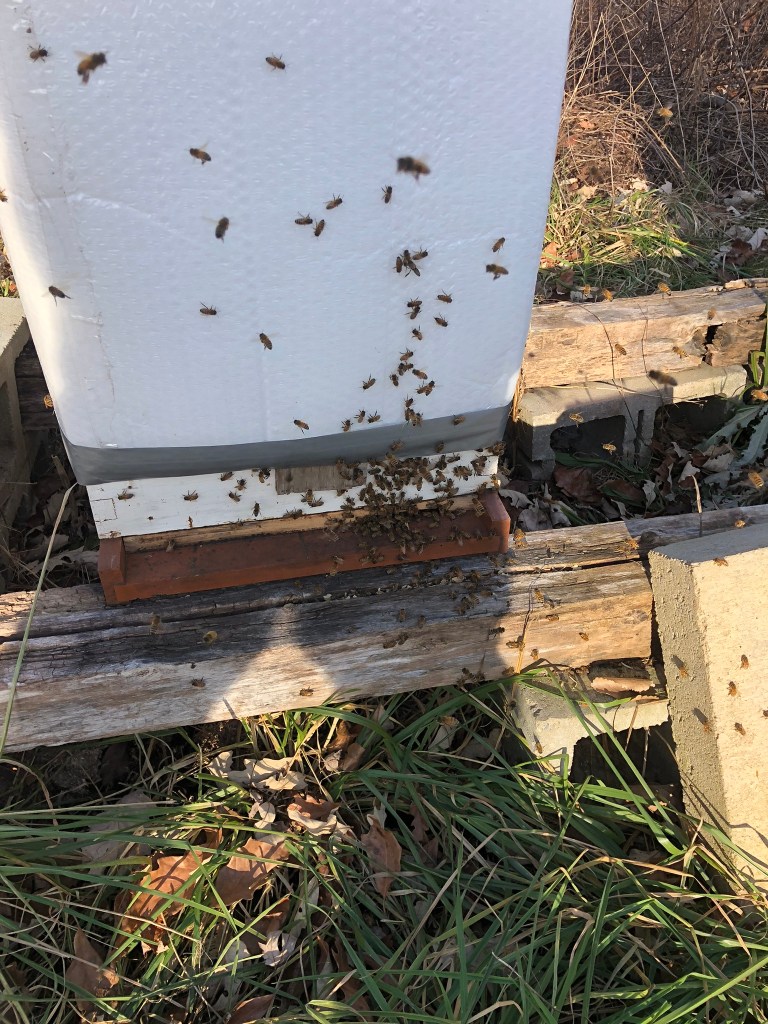 12/26 The yellow hive was the other hive that died. It’s higher because it was weak and I added sugar to the top. It didn’t matter, the queen died when the hives were treated in August from formic pro.