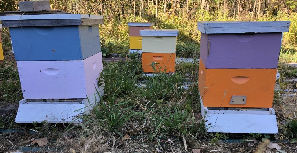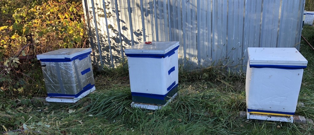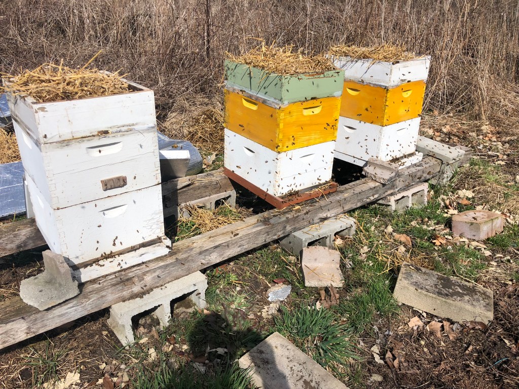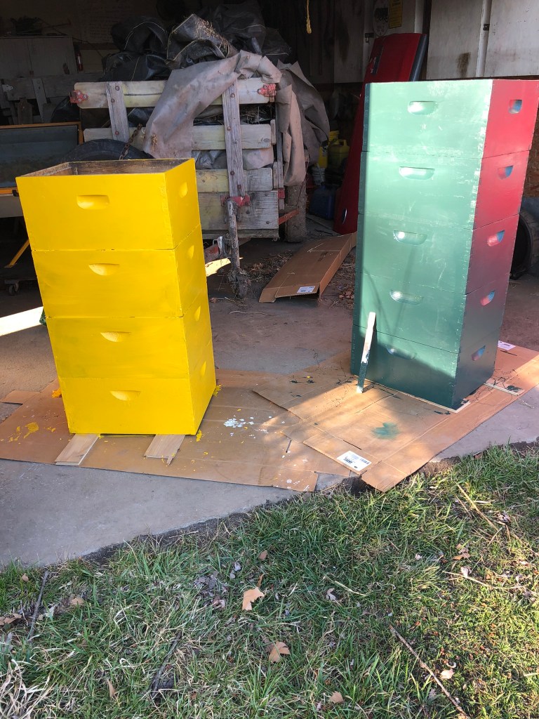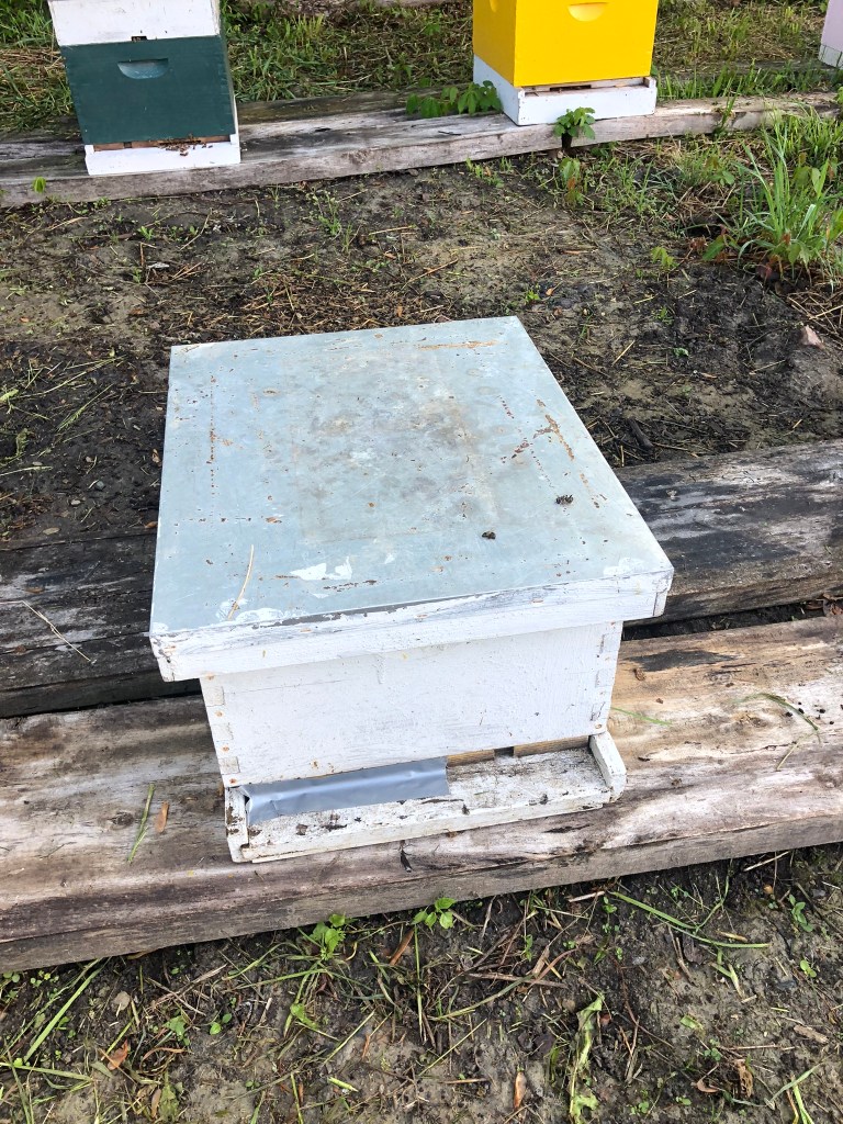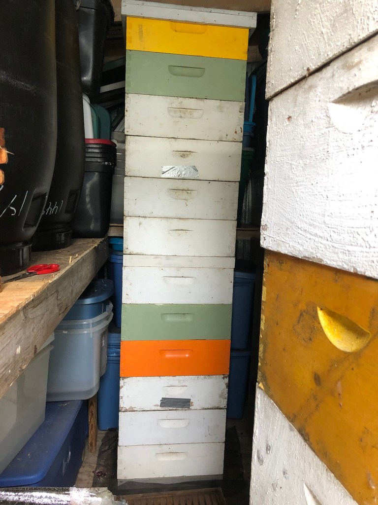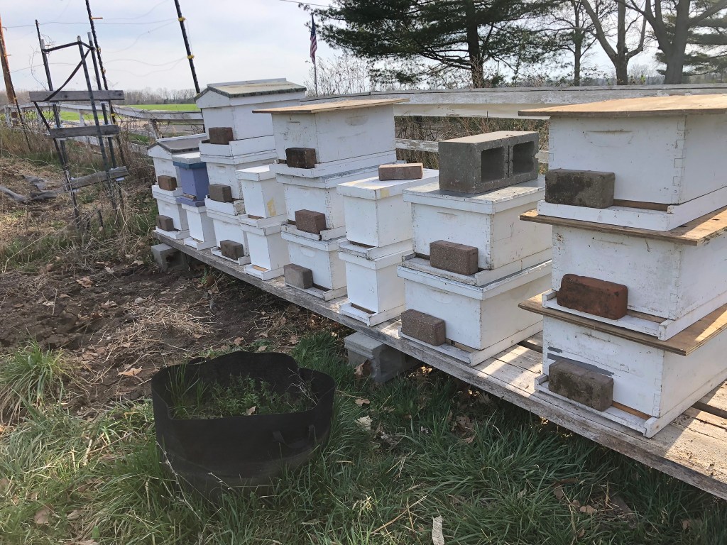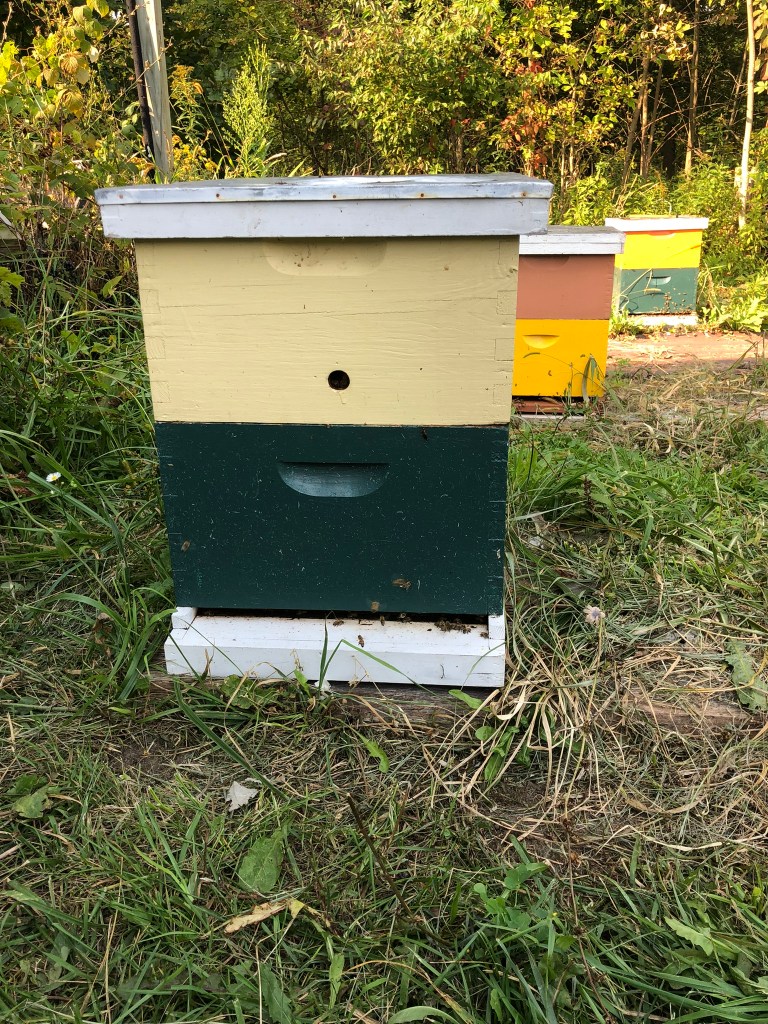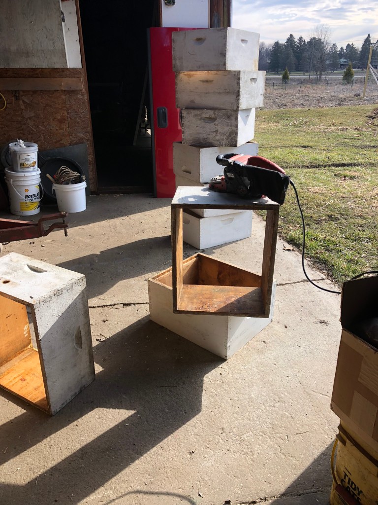12/26 The yellow hive was the other hive that died. It’s higher because it was weak and I added sugar to the top. It didn’t matter, the queen died when the hives were treated in August from formic pro.