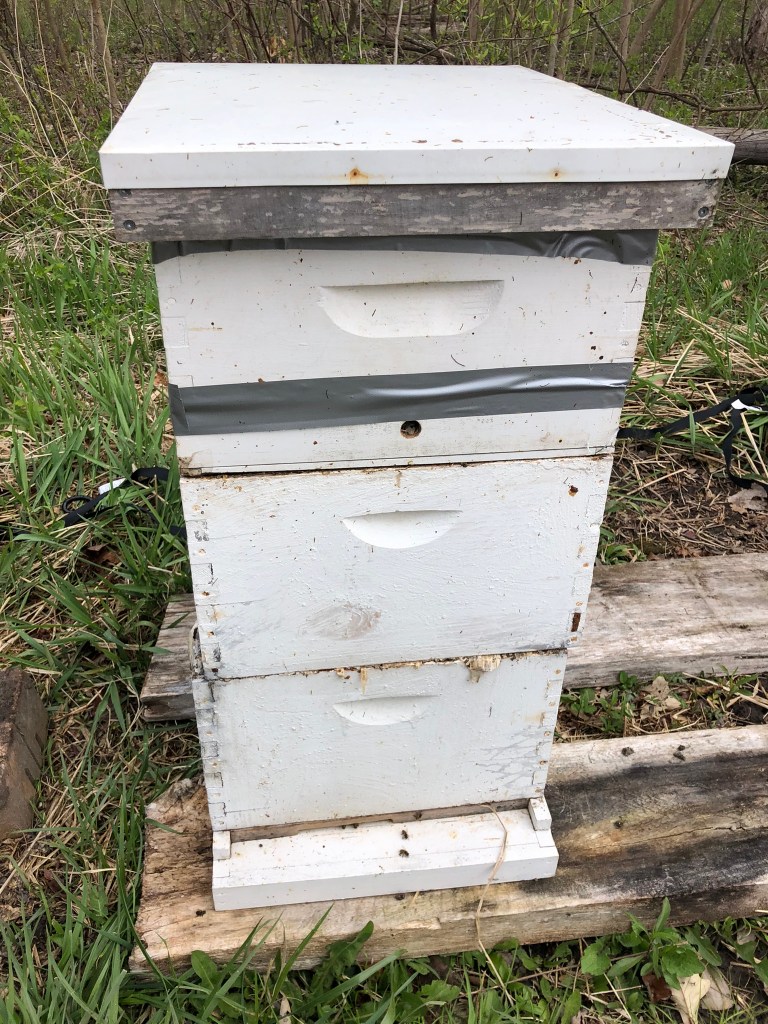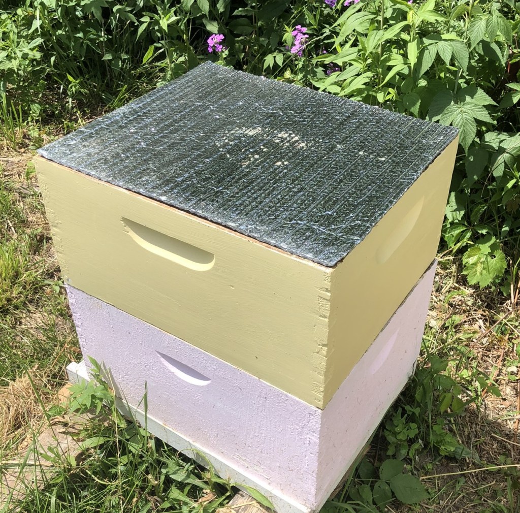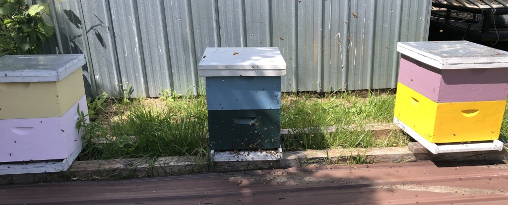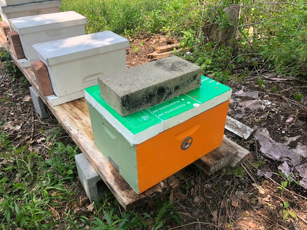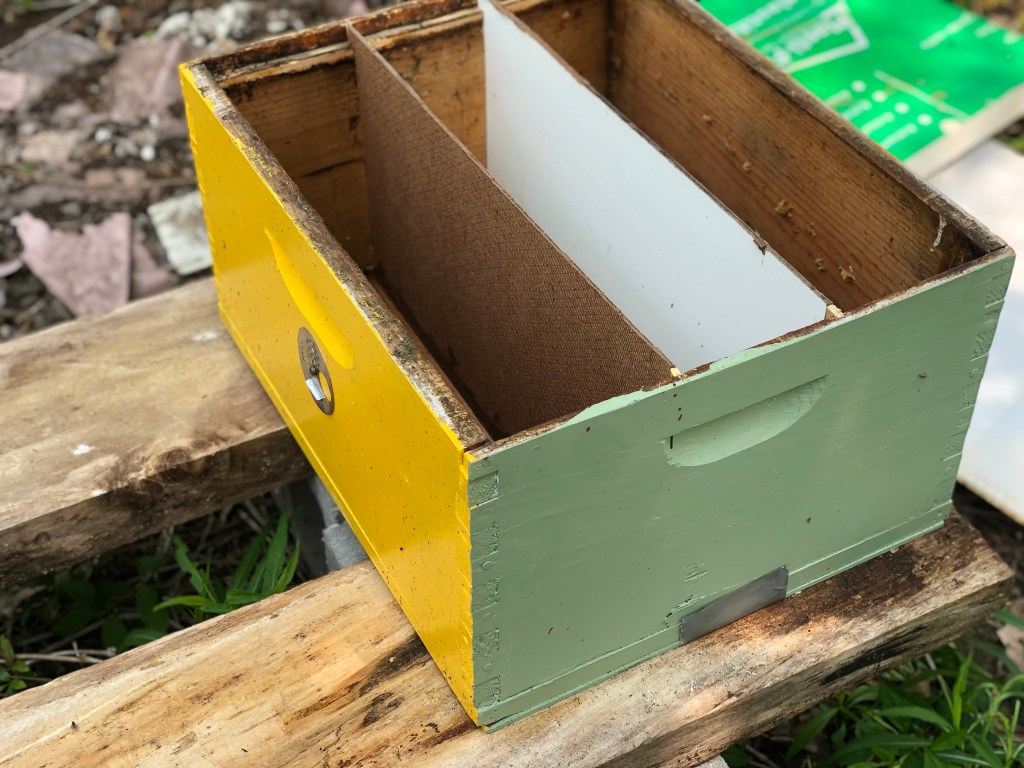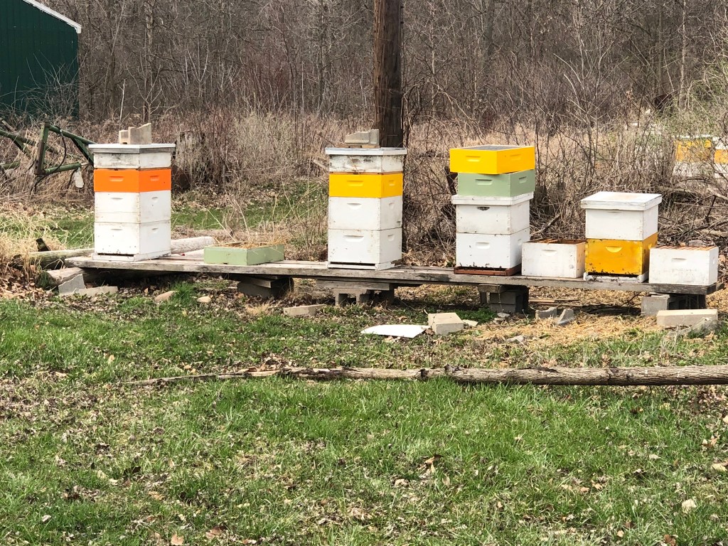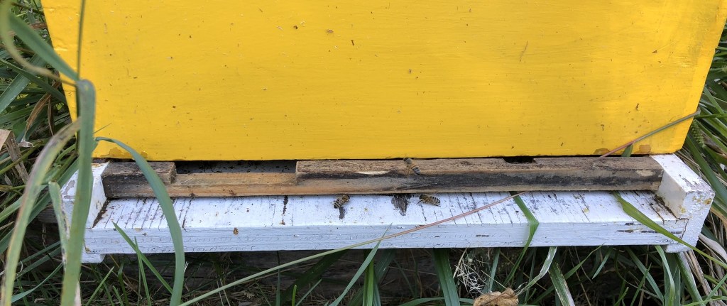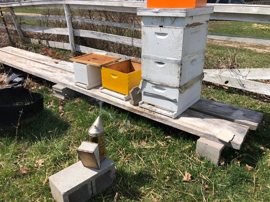 12/26 The yellow hive was the other hive that died. It’s higher because it was weak and I added sugar to the top. It didn’t matter, the queen died when the hives were treated in August from formic pro.