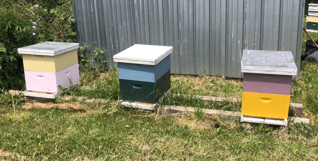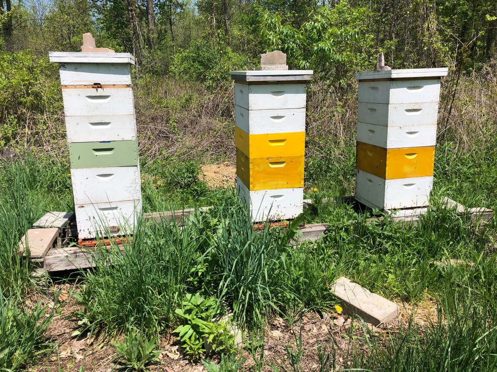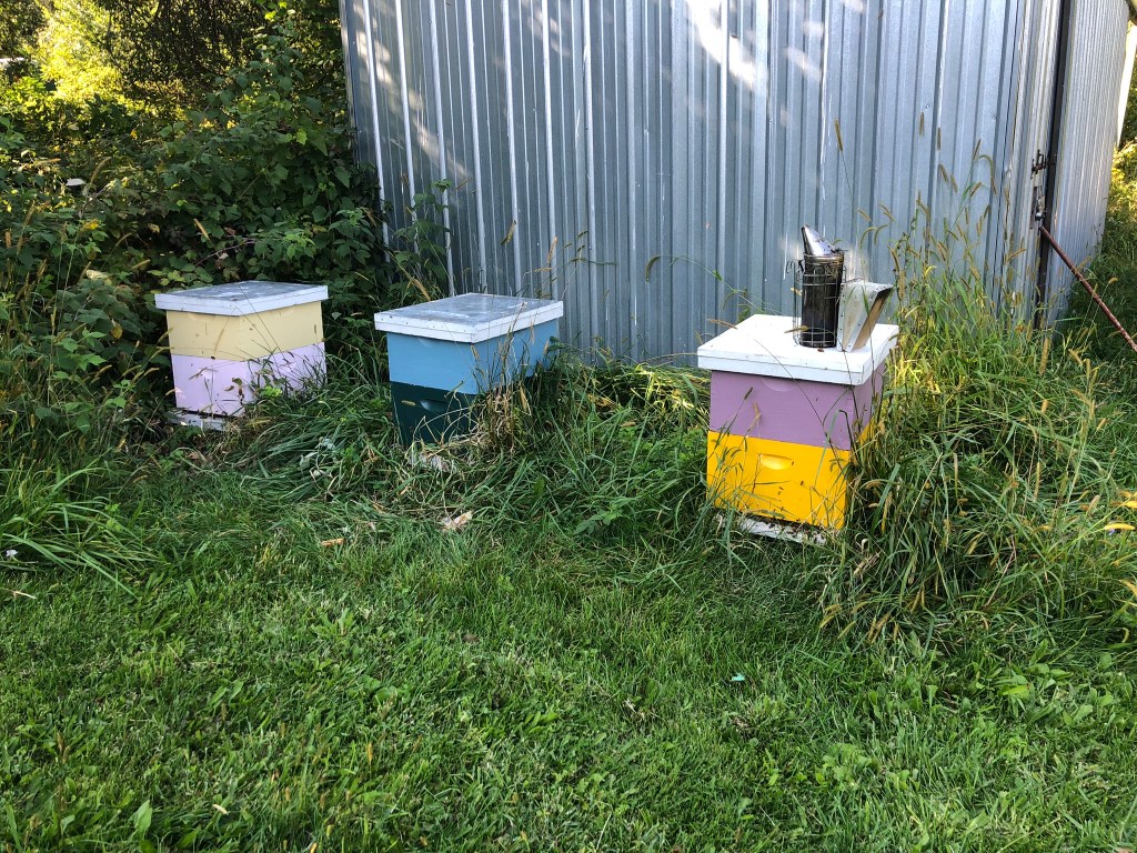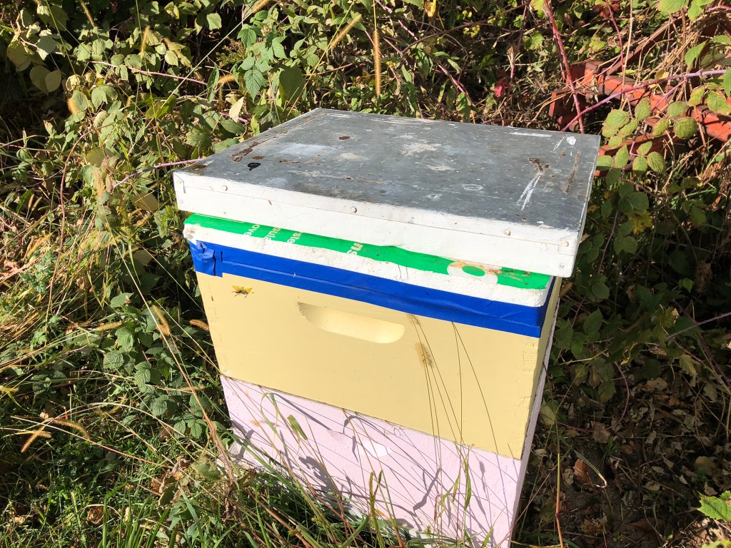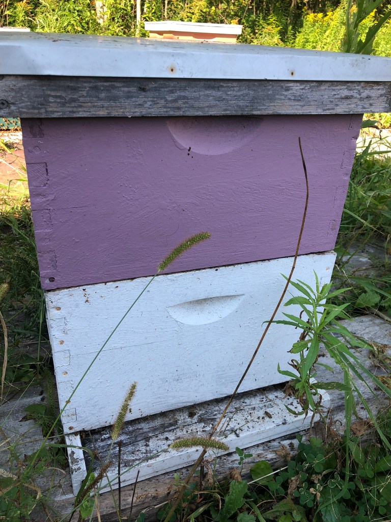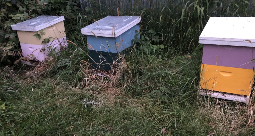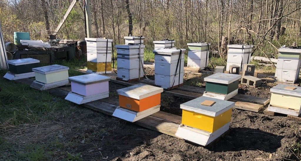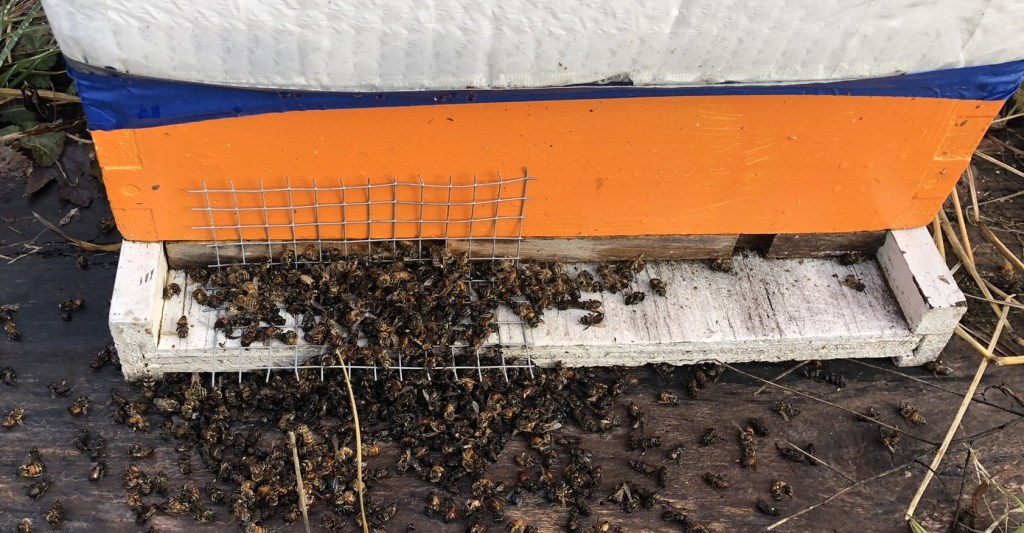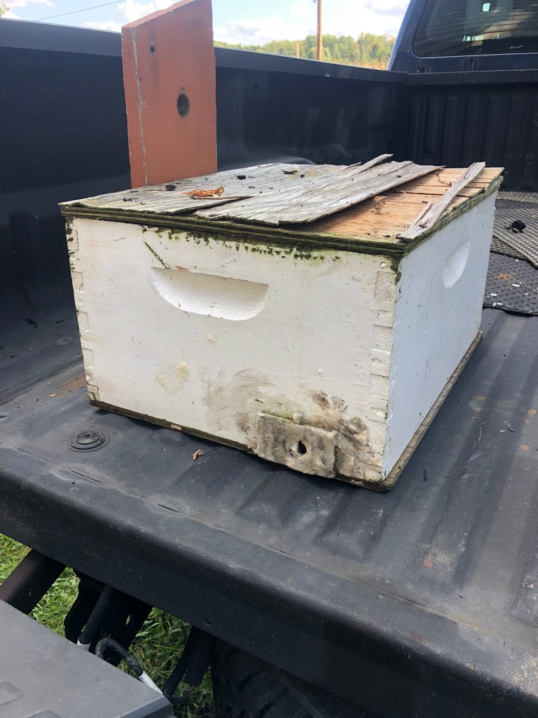 12/26 The yellow hive was the other hive that died. It’s higher because it was weak and I added sugar to the top. It didn’t matter, the queen died when the hives were treated in August from formic pro.