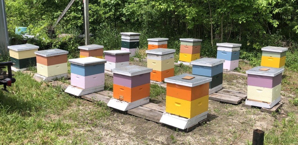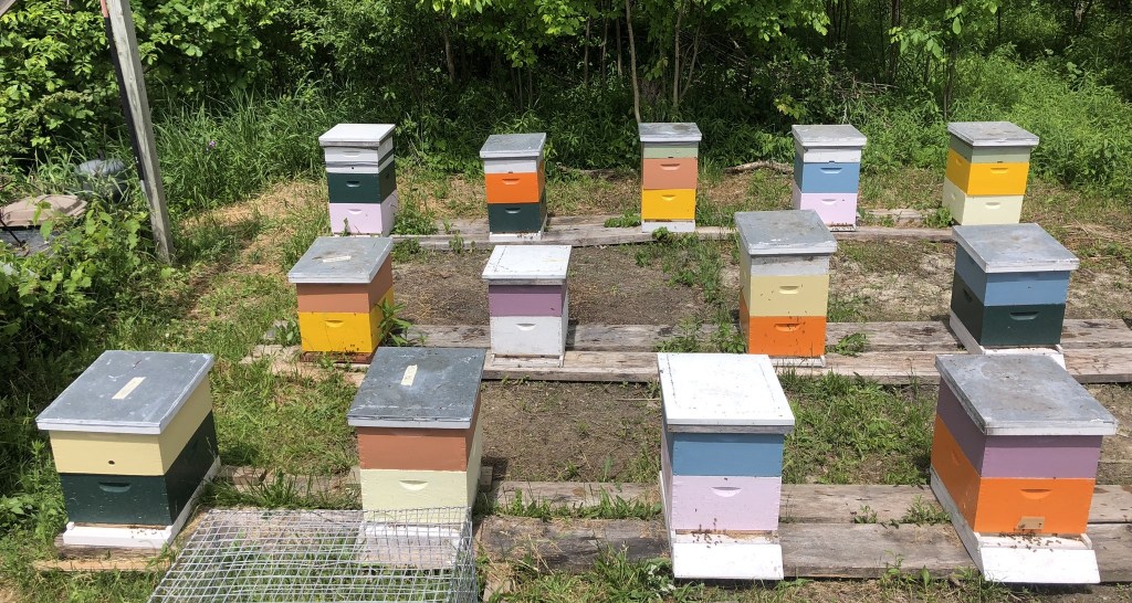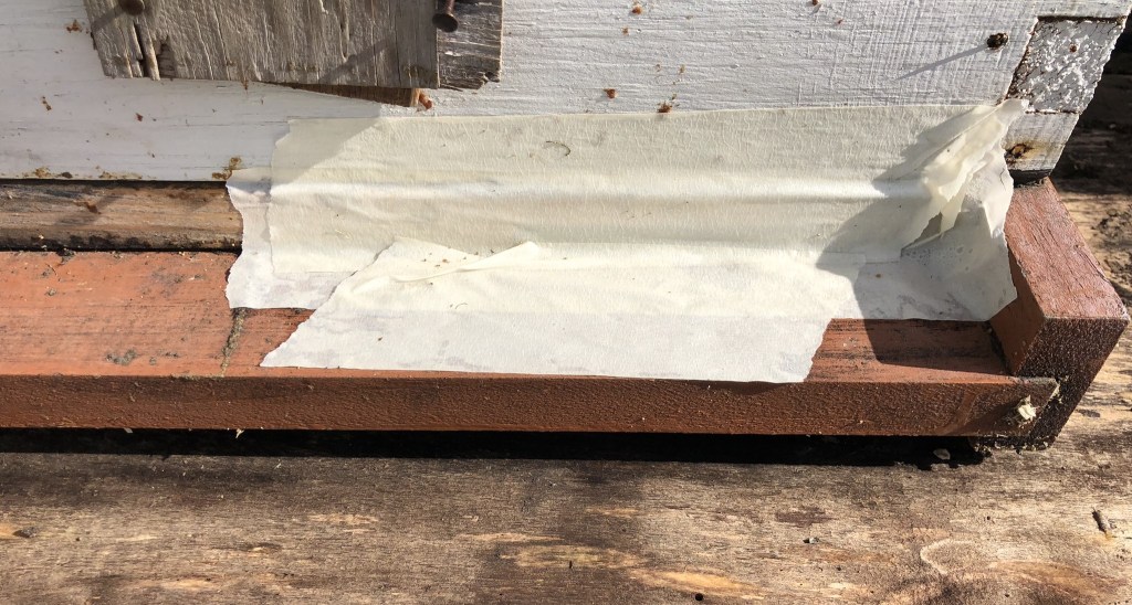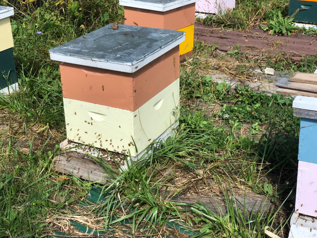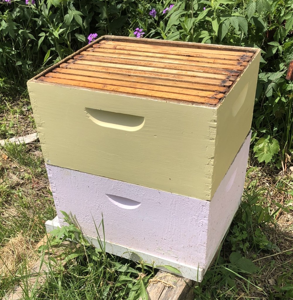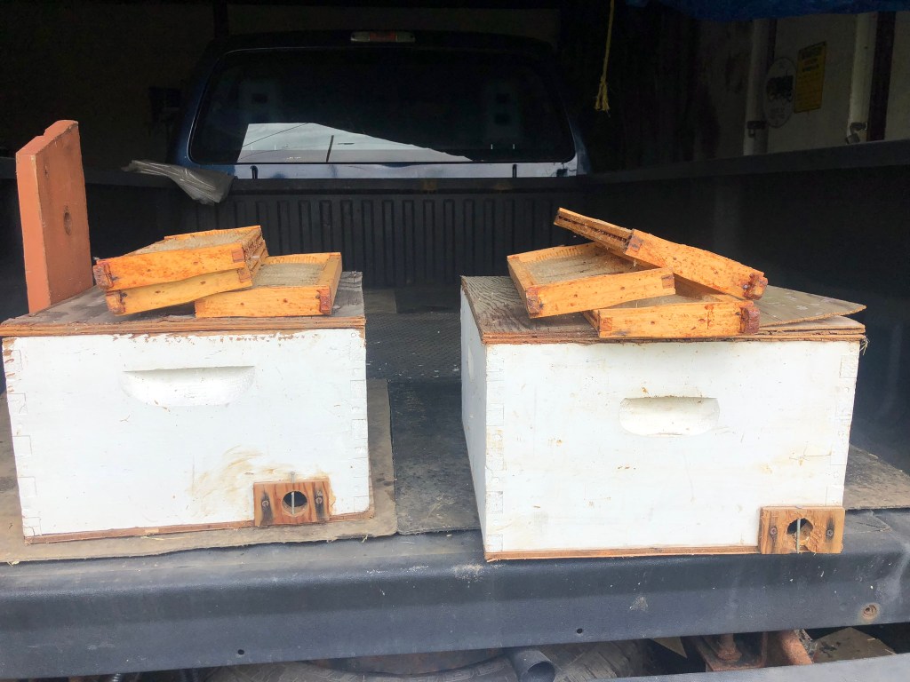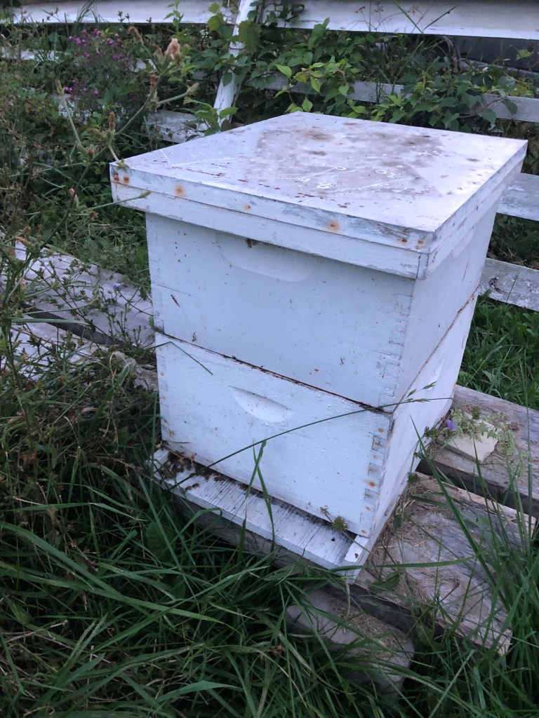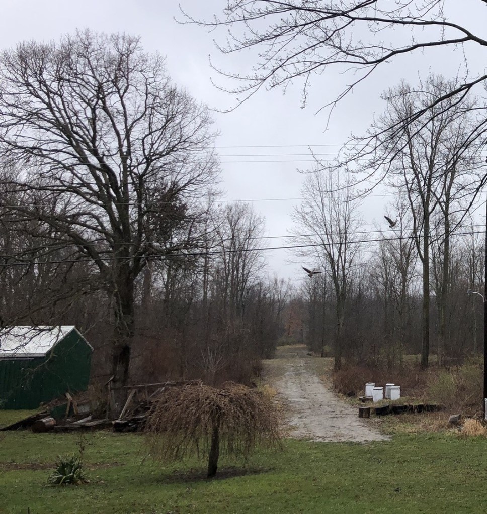 12/26 The yellow hive was the other hive that died. It’s higher because it was weak and I added sugar to the top. It didn’t matter, the queen died when the hives were treated in August from formic pro.
