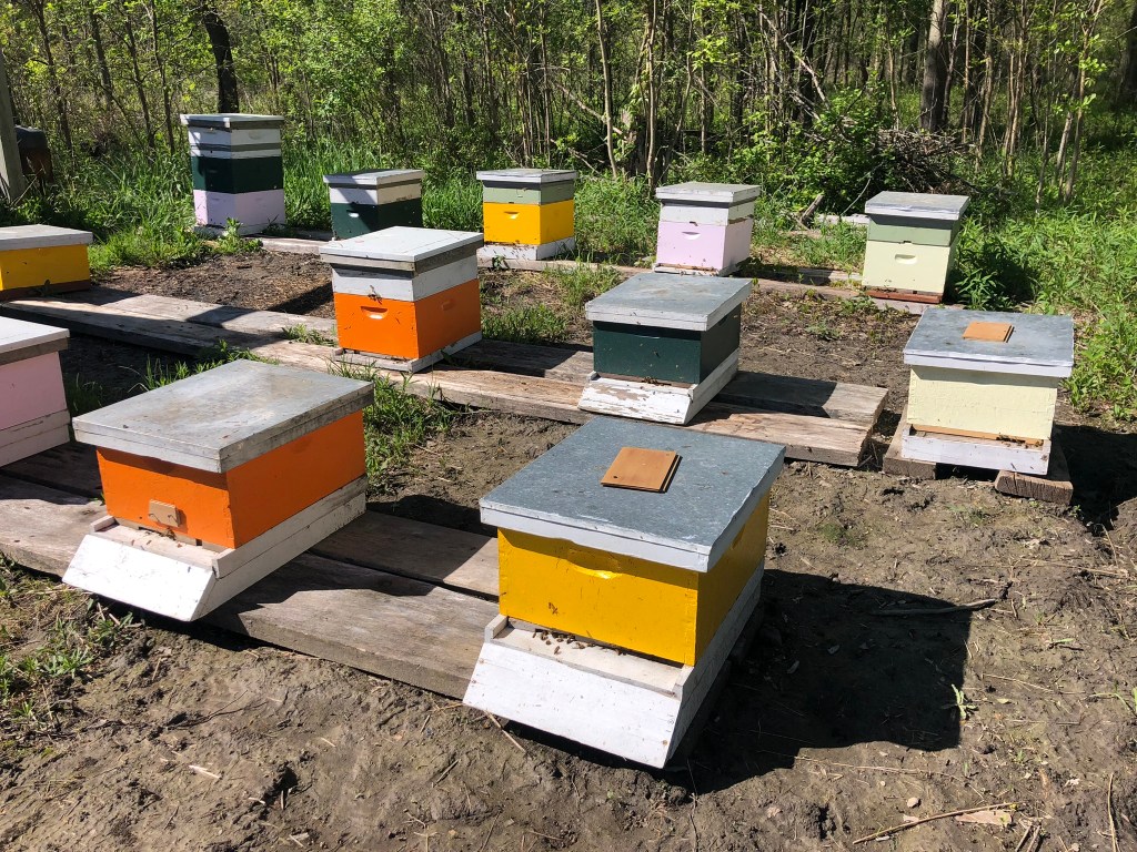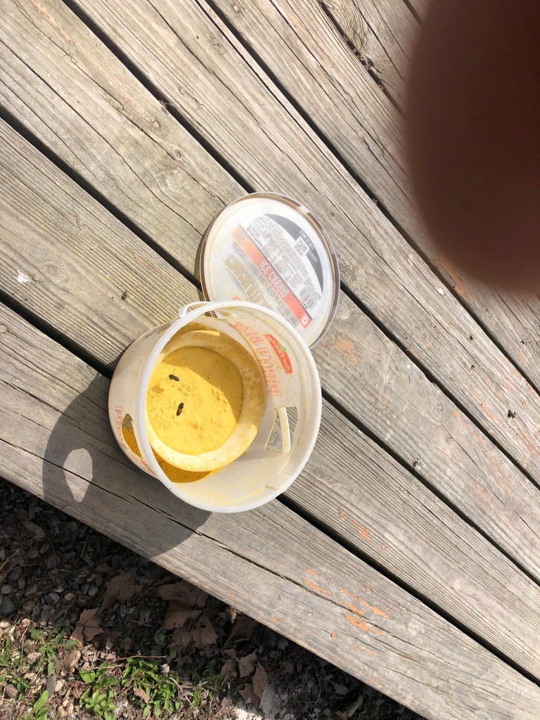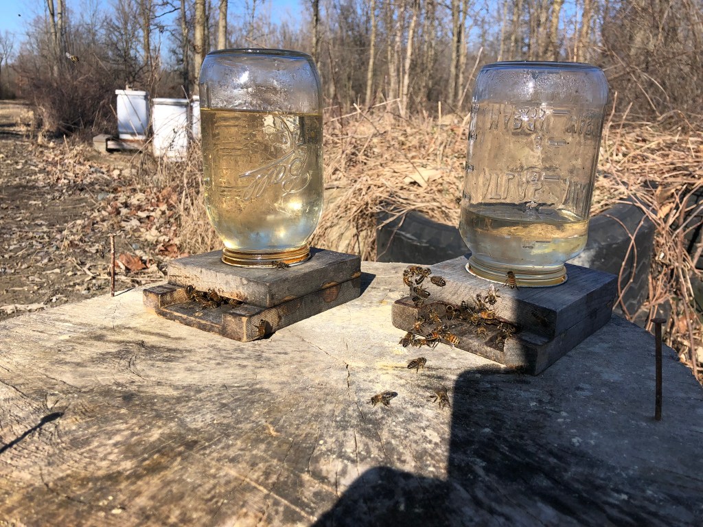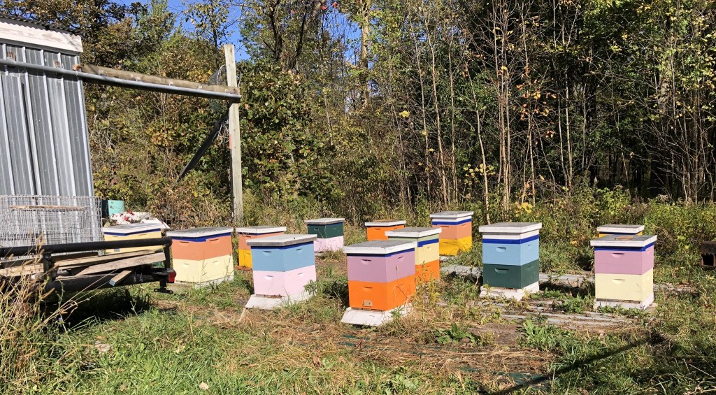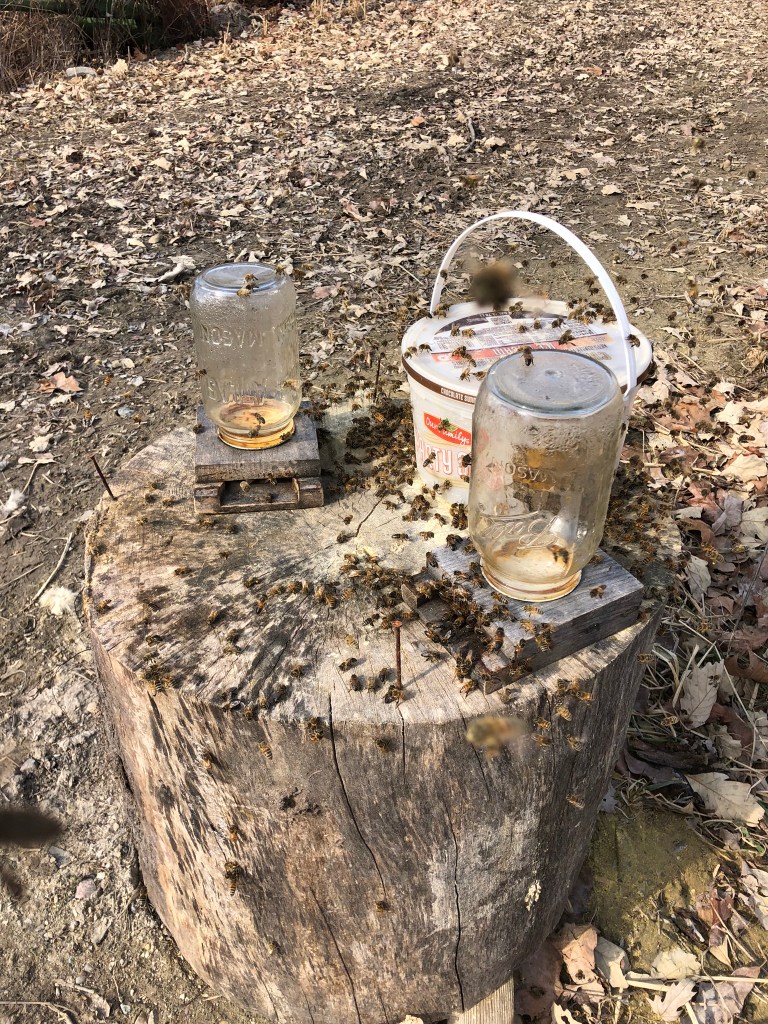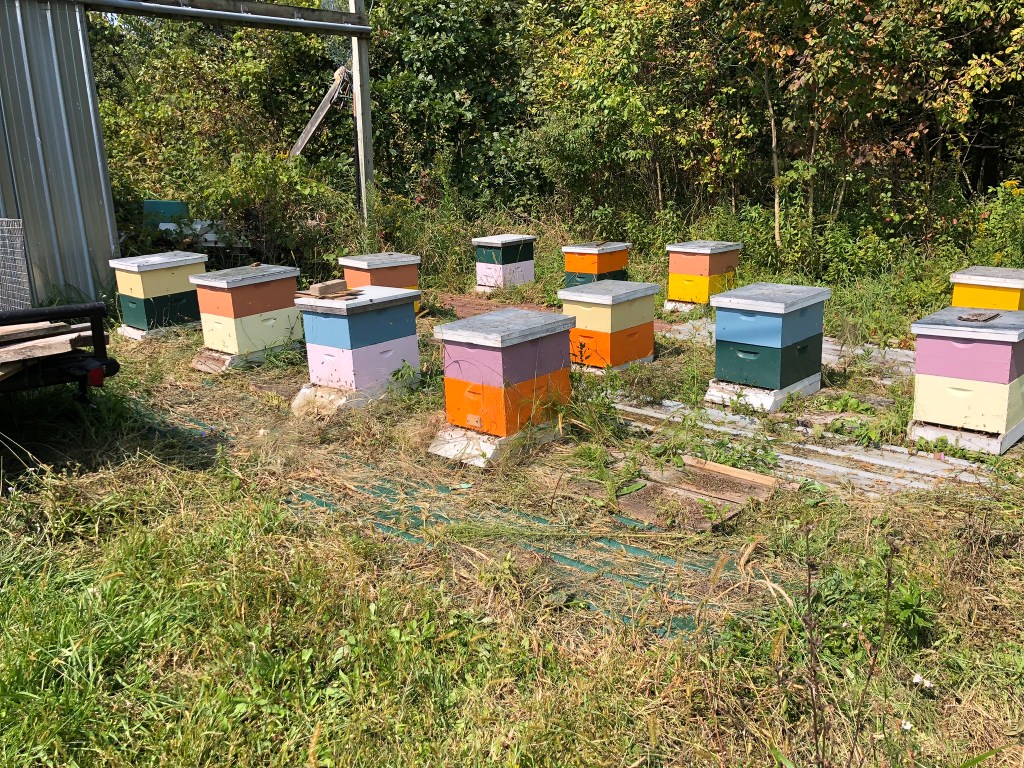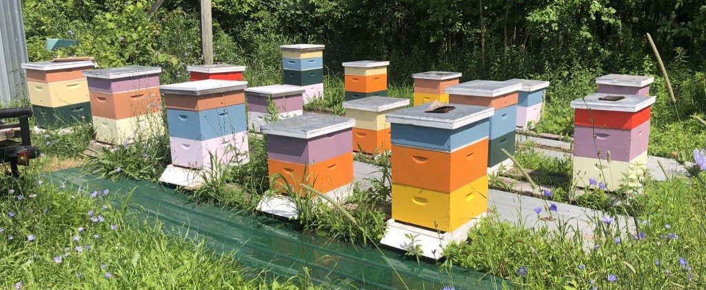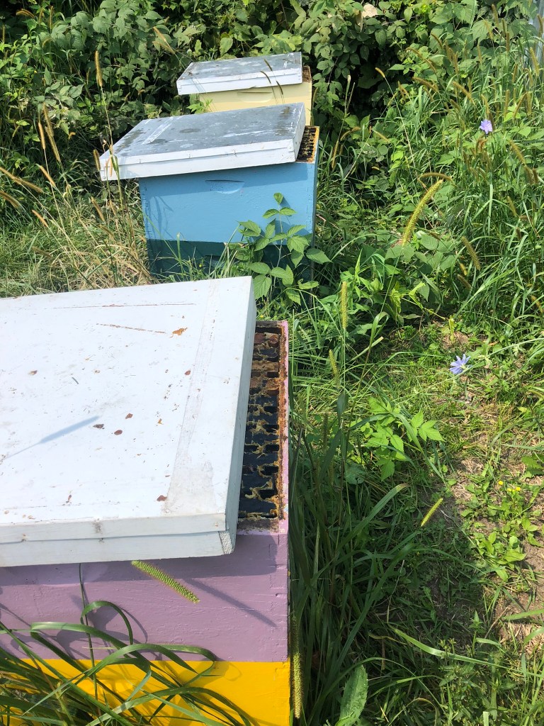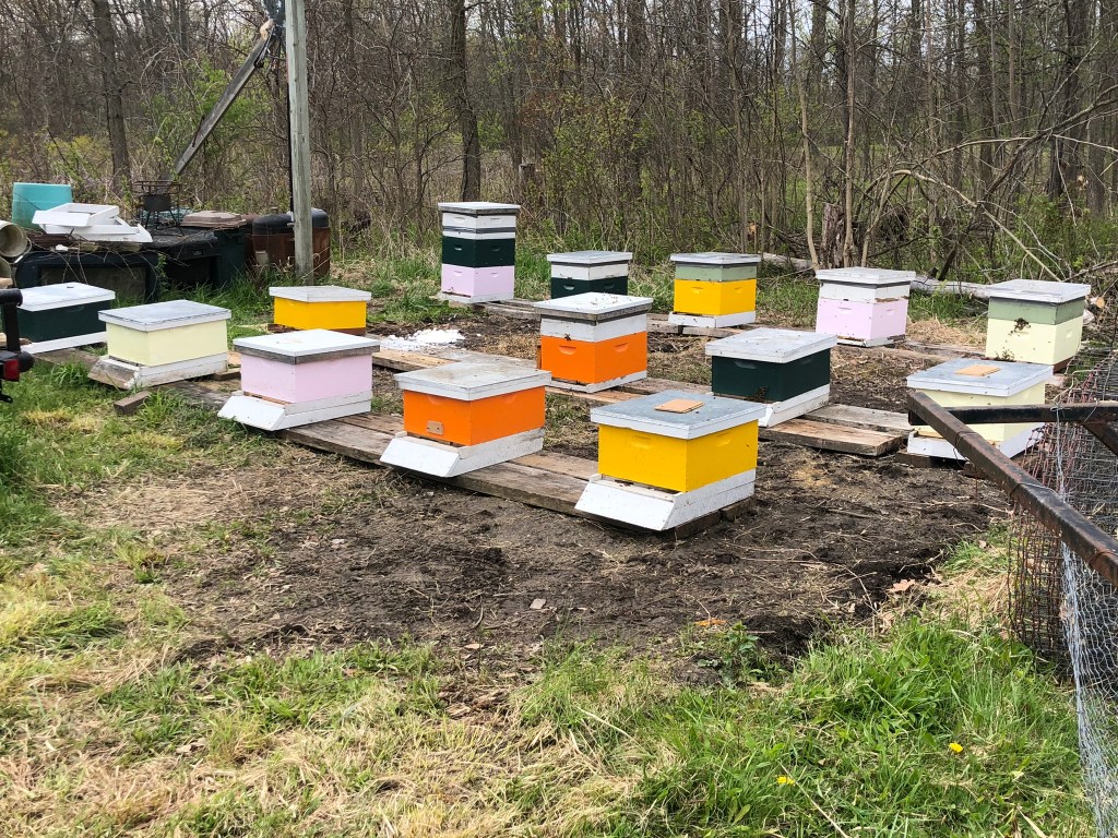 12/26 The yellow hive was the other hive that died. It’s higher because it was weak and I added sugar to the top. It didn’t matter, the queen died when the hives were treated in August from formic pro.