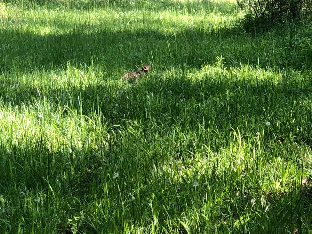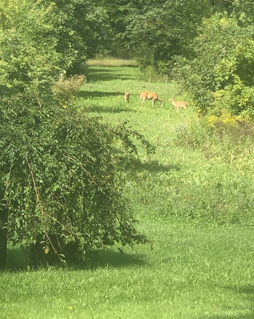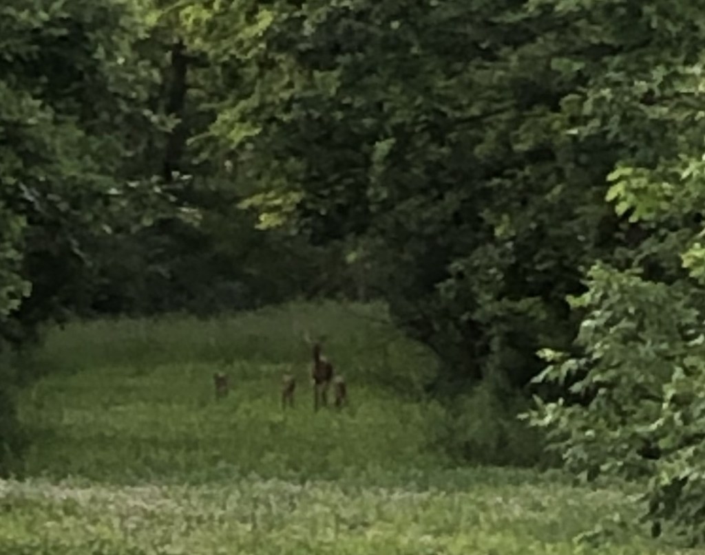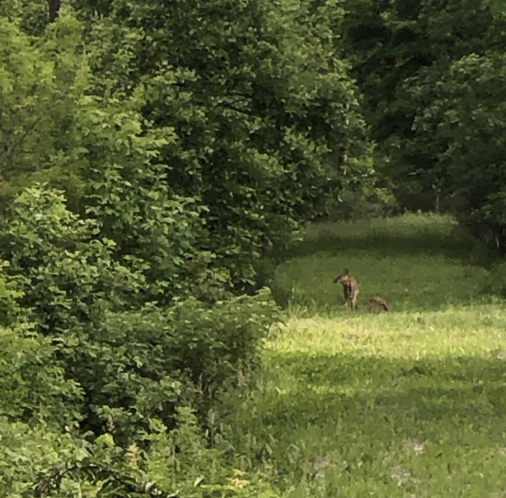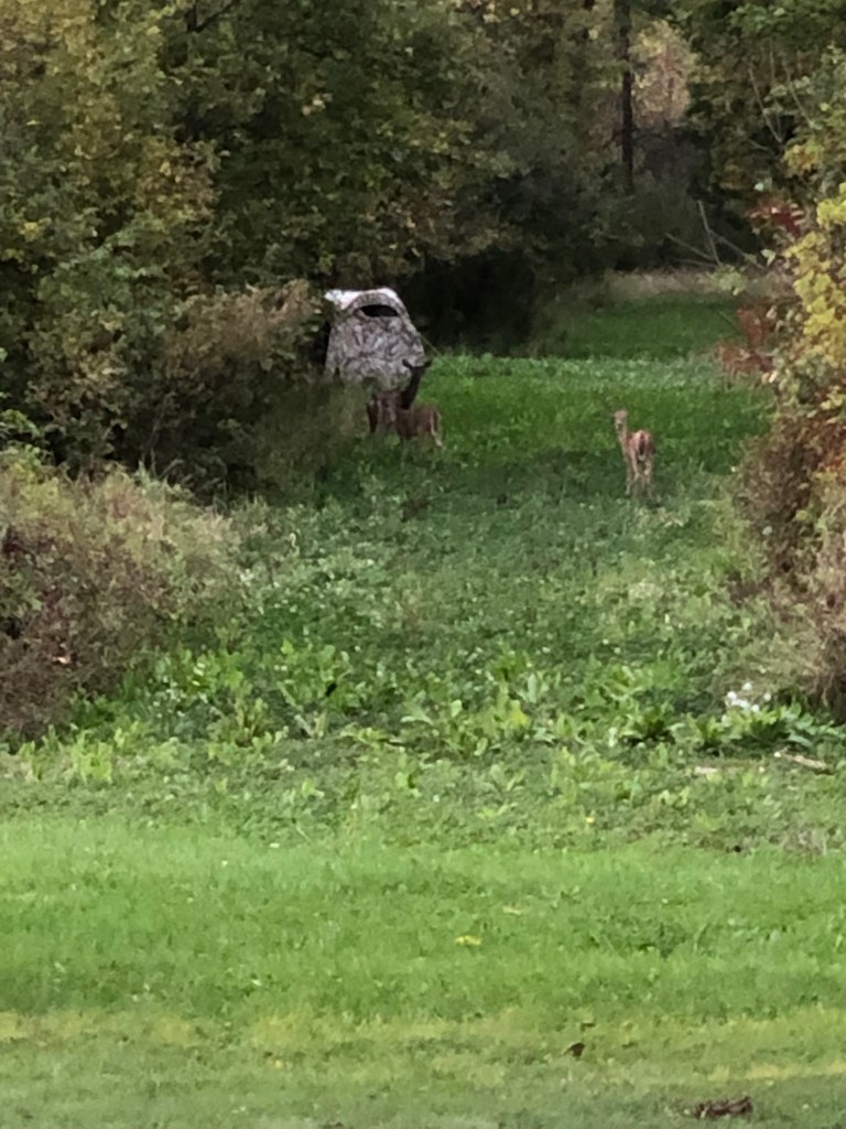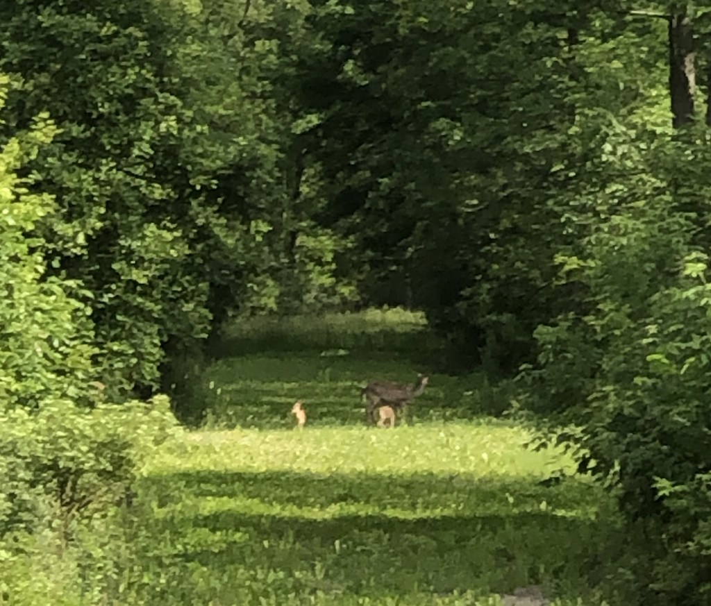 Three deer had fawns on the path behind the house. One had twins, one of the twins wants to play more than the other one.