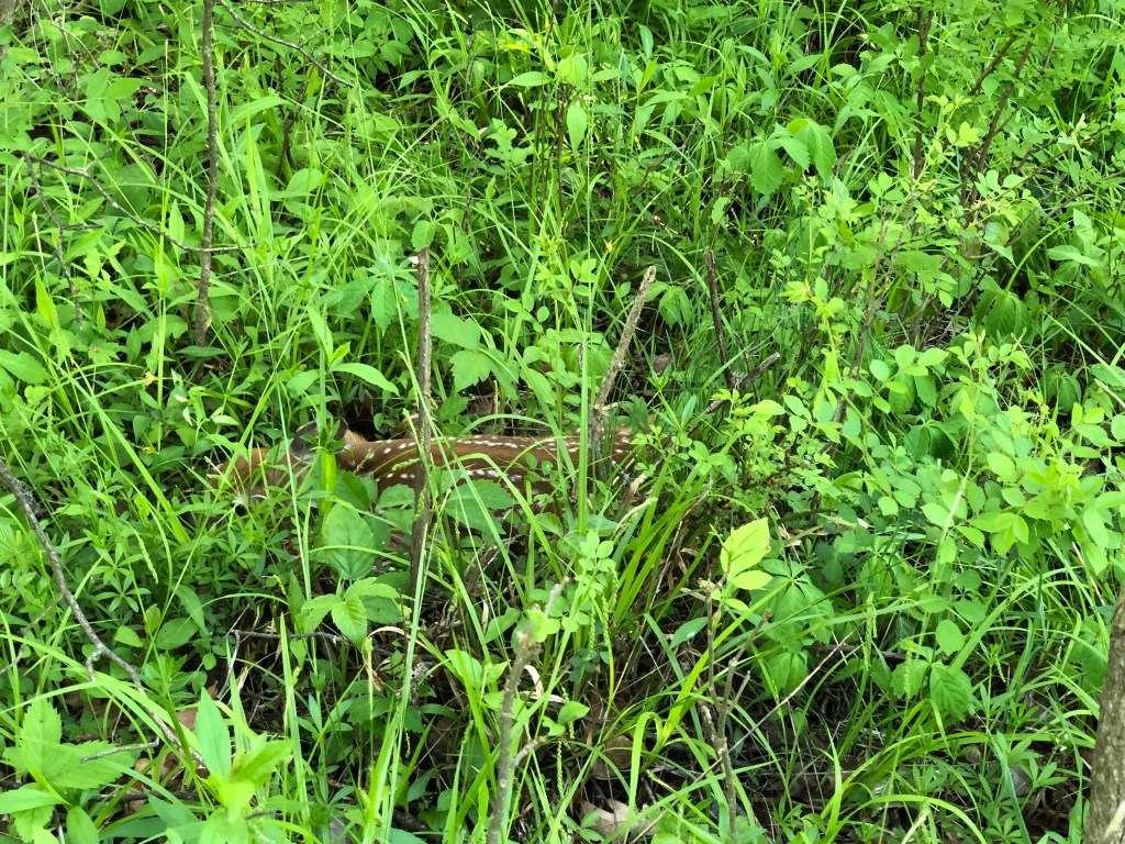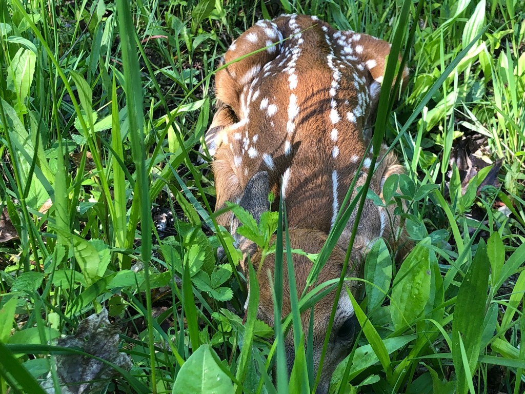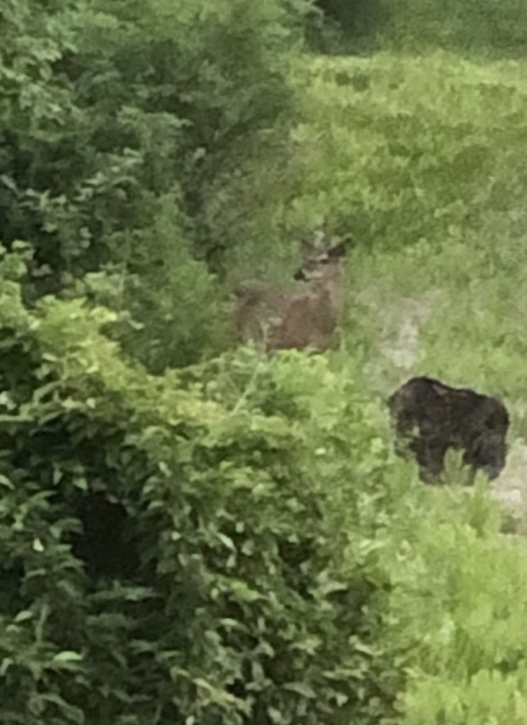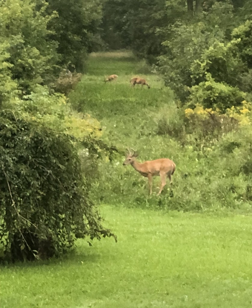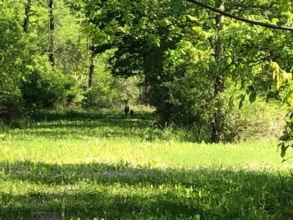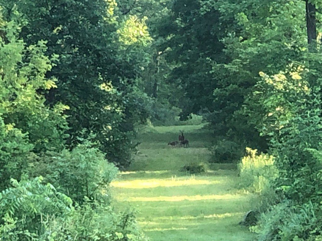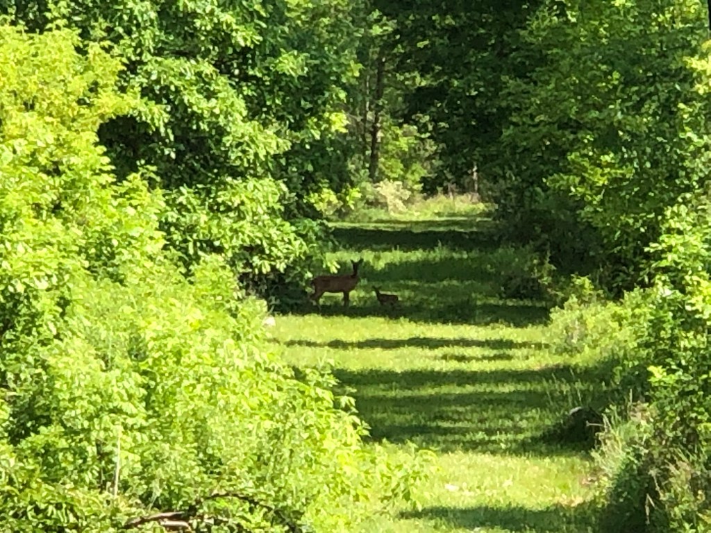 Three deer had fawns on the path behind the house. One had twins, one of the twins wants to play more than the other one.