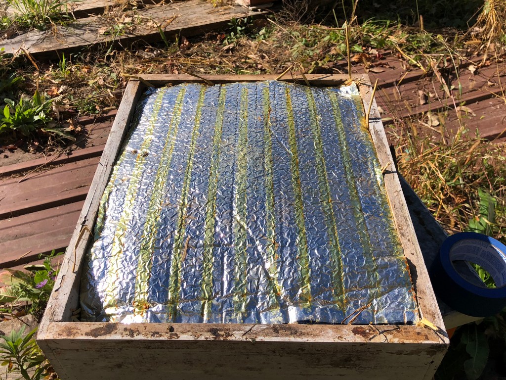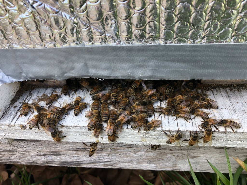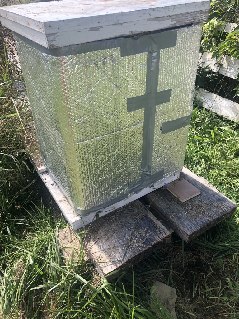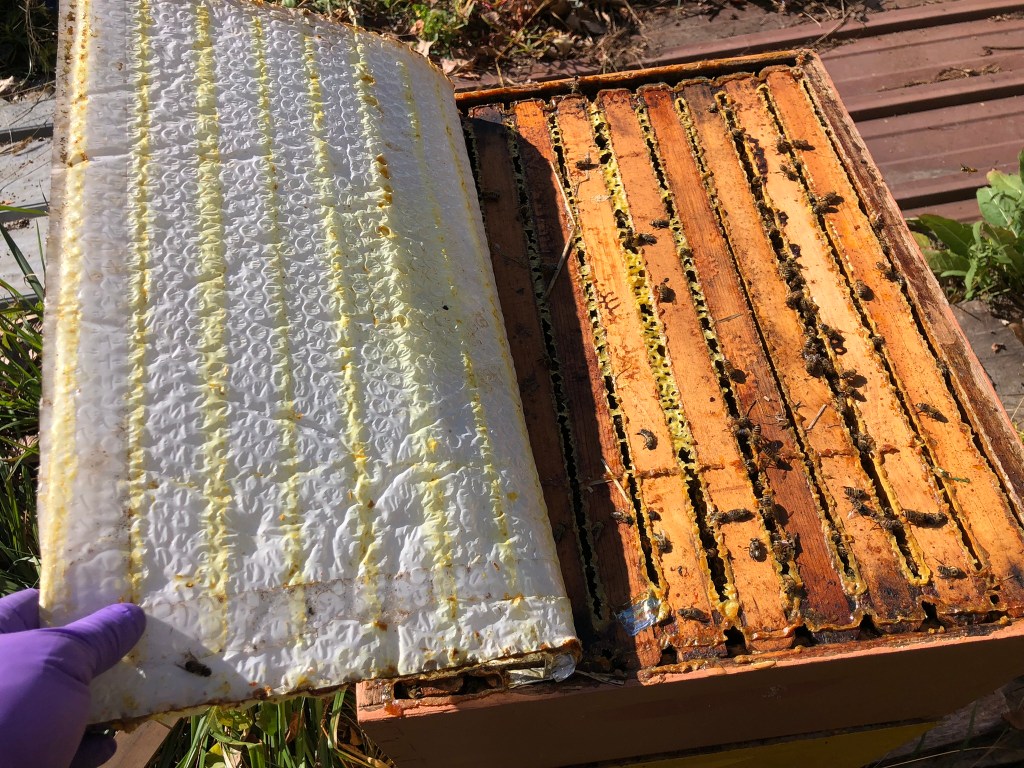 Unwrapped the bee hives and checked out the quilts. The quilt wicked up moisture and keep them warm.
