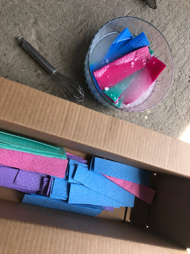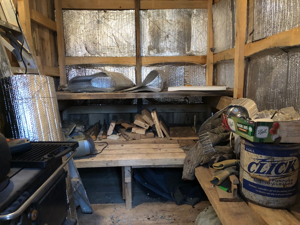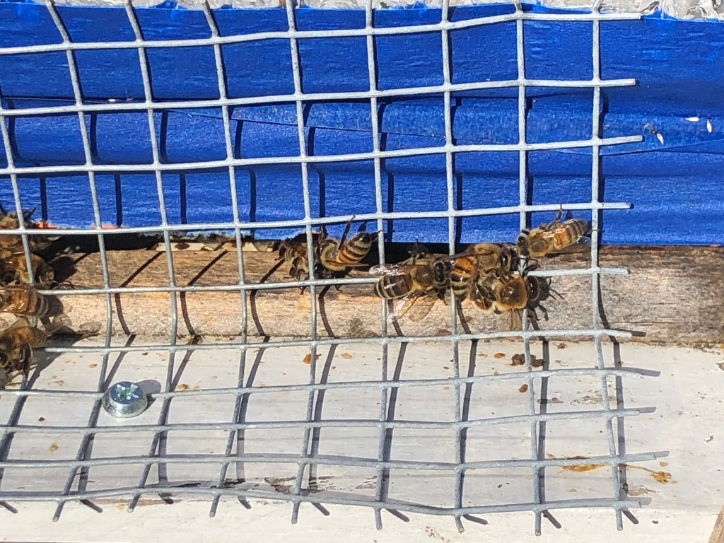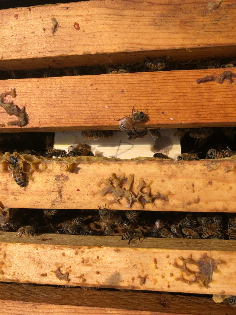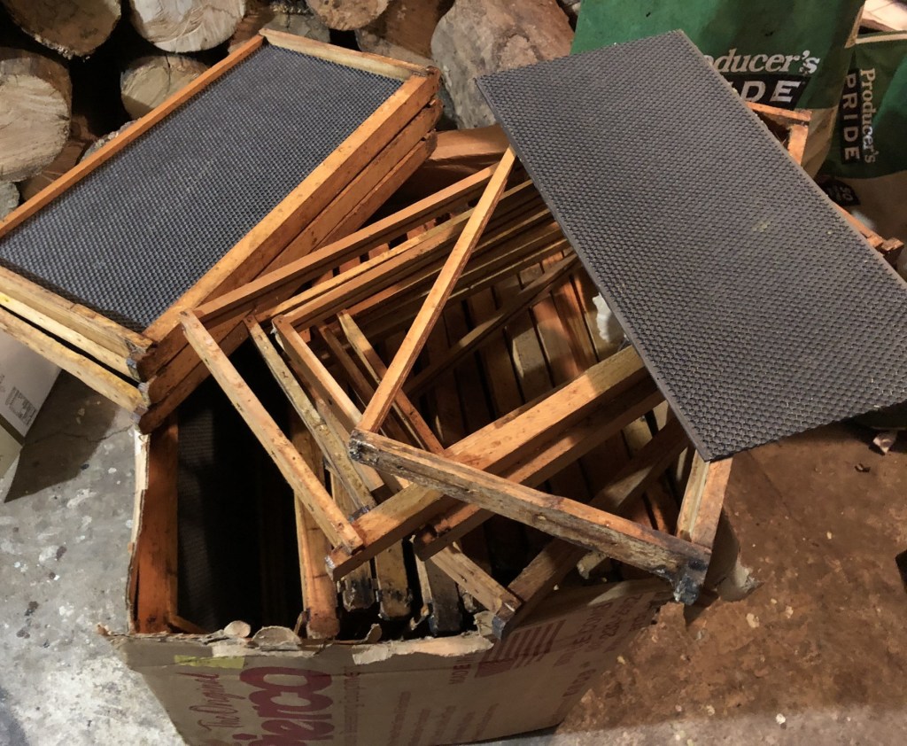 Unwrapped the bee hives and checked out the quilts. The quilt wicked up moisture and keep them warm.
