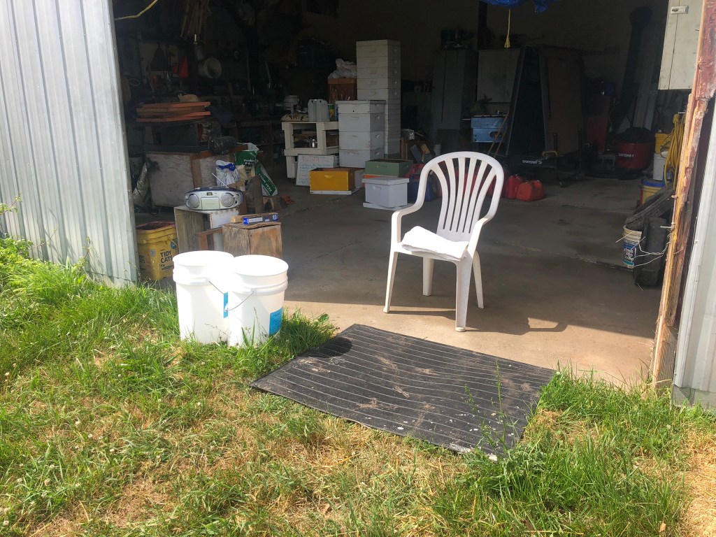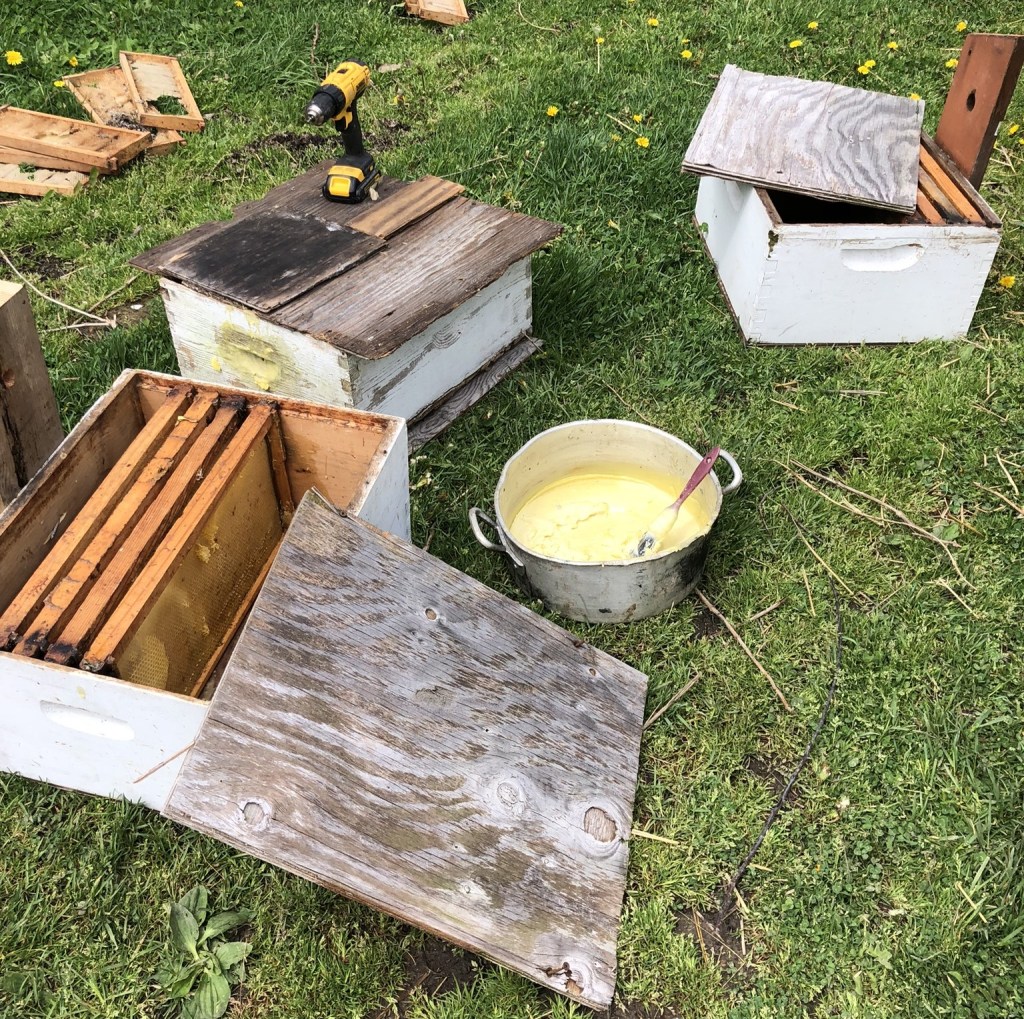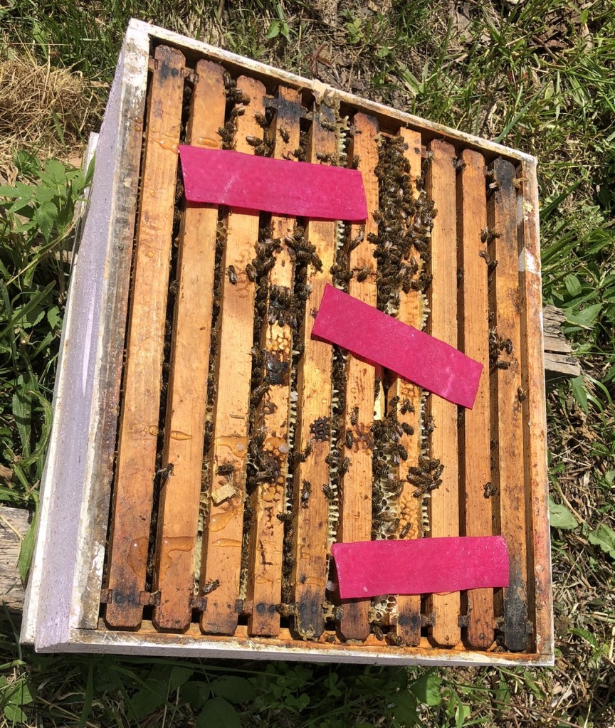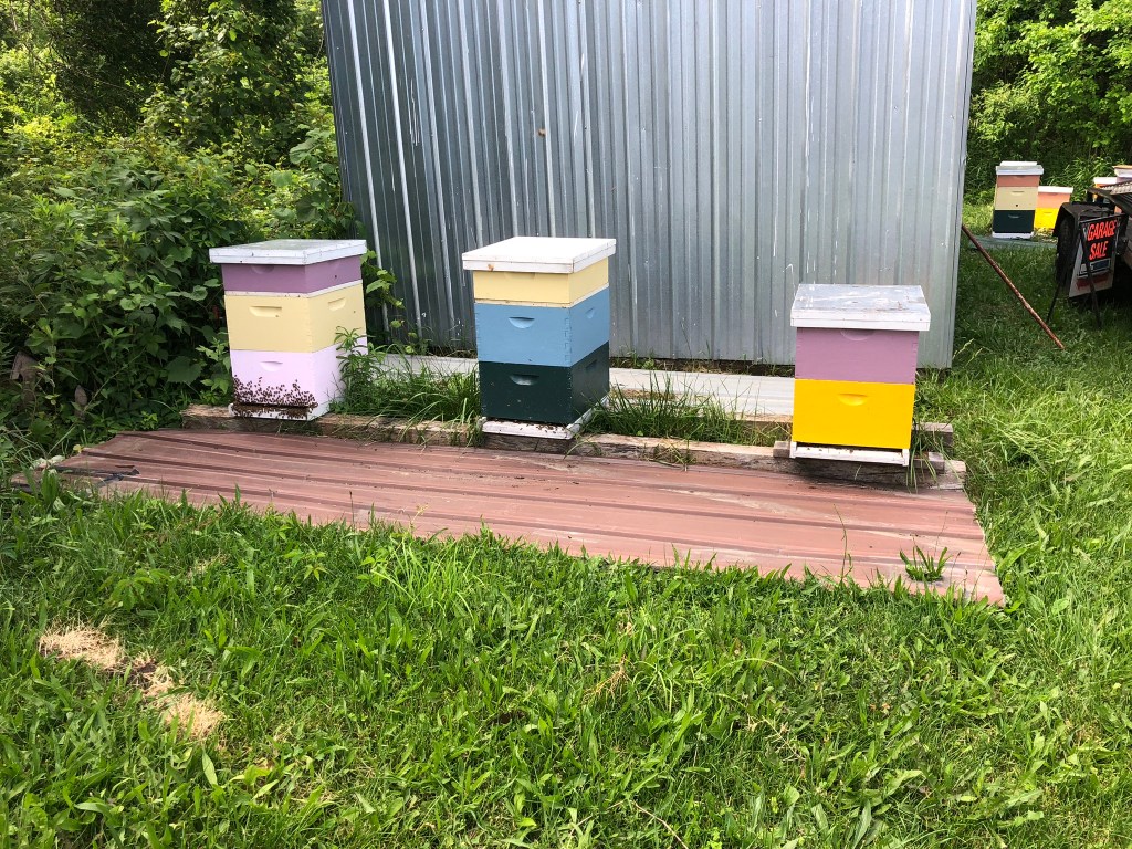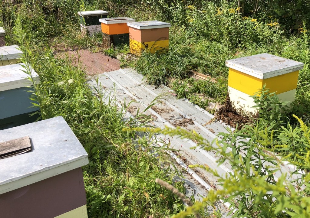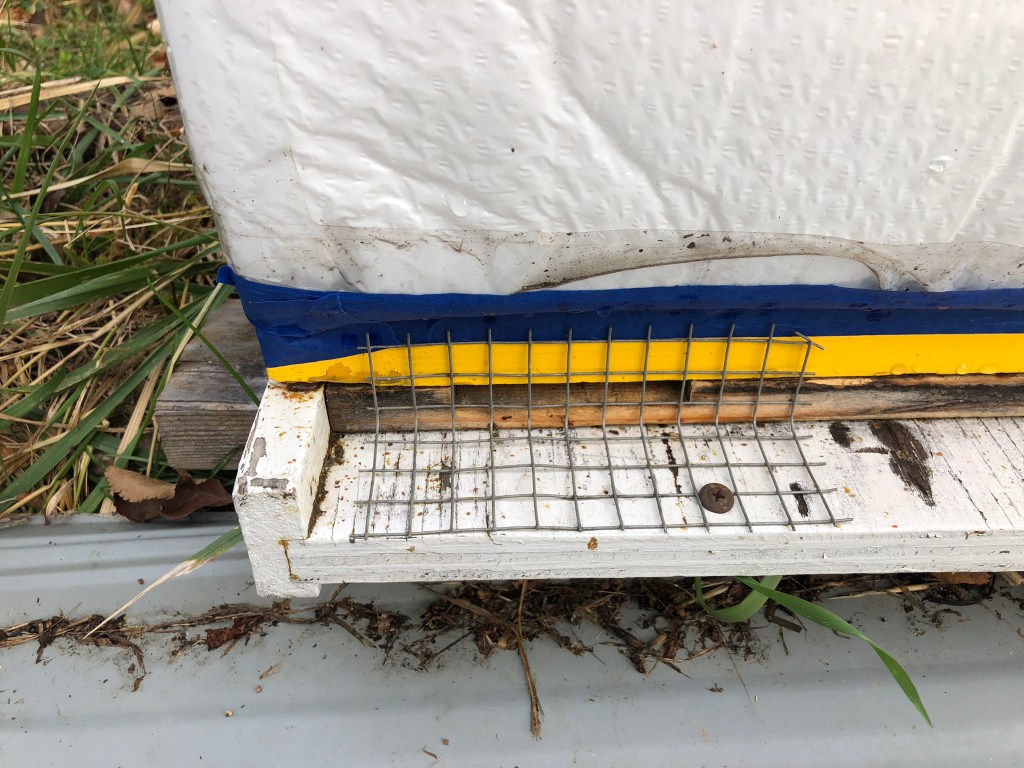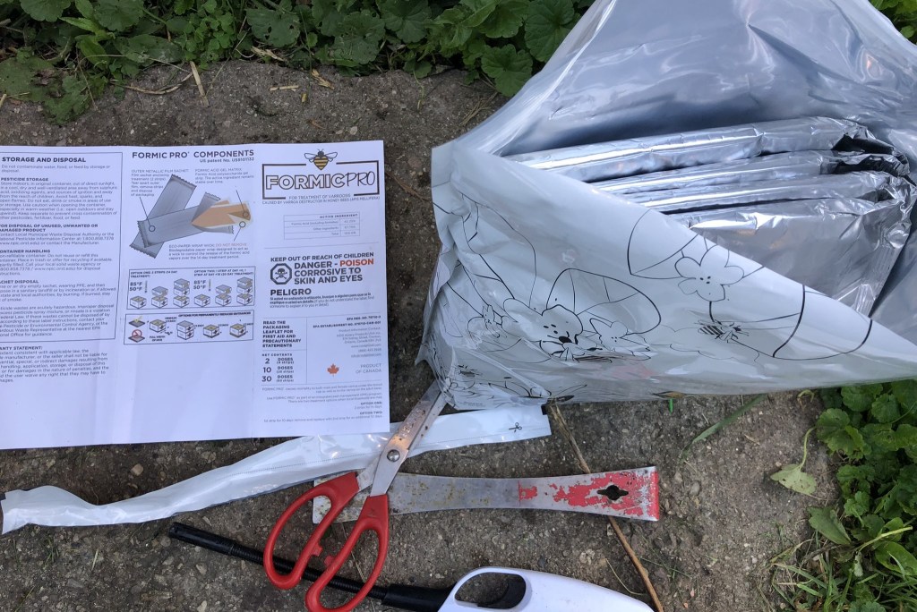 This is a photo of my hives being treated two years ago with formic pro, the vapors even kills the grass in front of the hive.