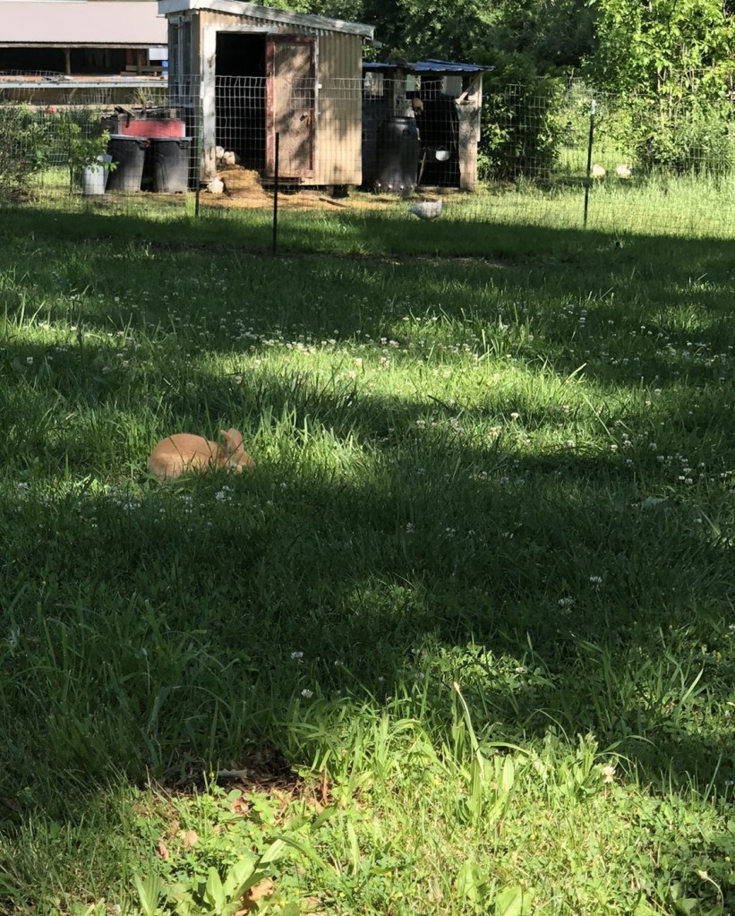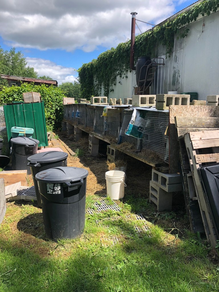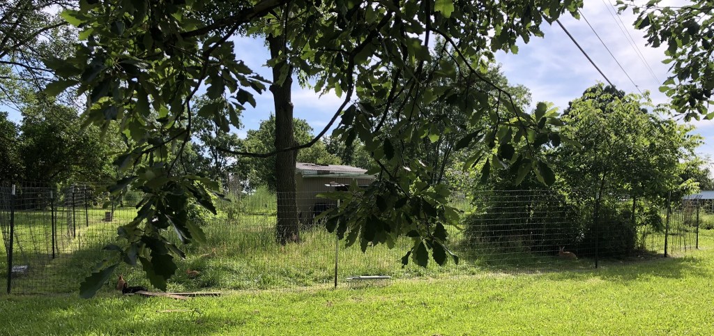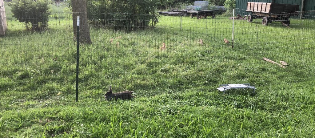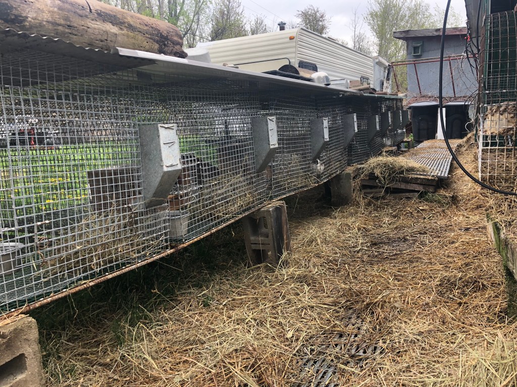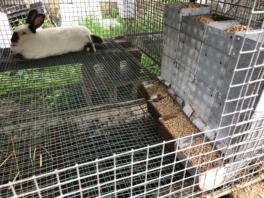 7/31 Adding feeders to rabbit cages. Right now the chickens can go 2-3 weeks without adding food and water. I am trying to make the rabbits good for a week. I hope to travel more and make it easy for people to take care of the animals when I am gone.