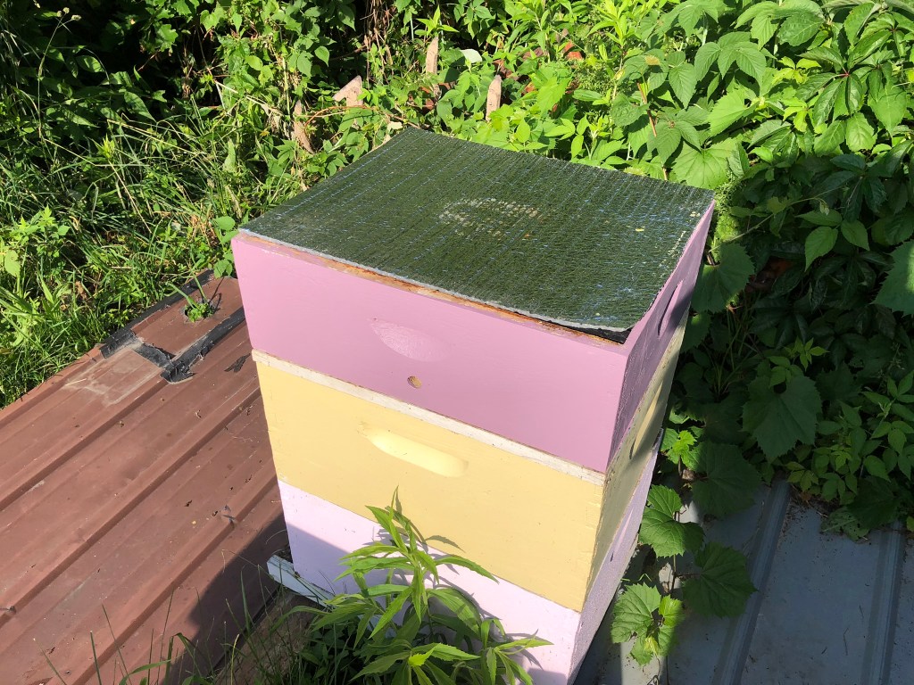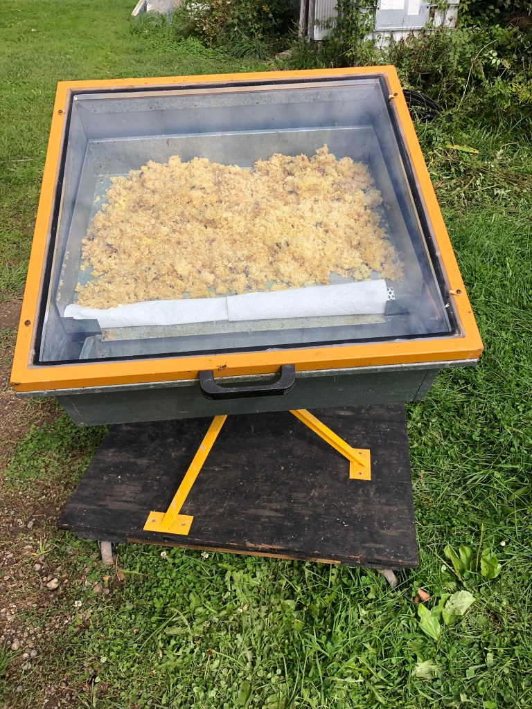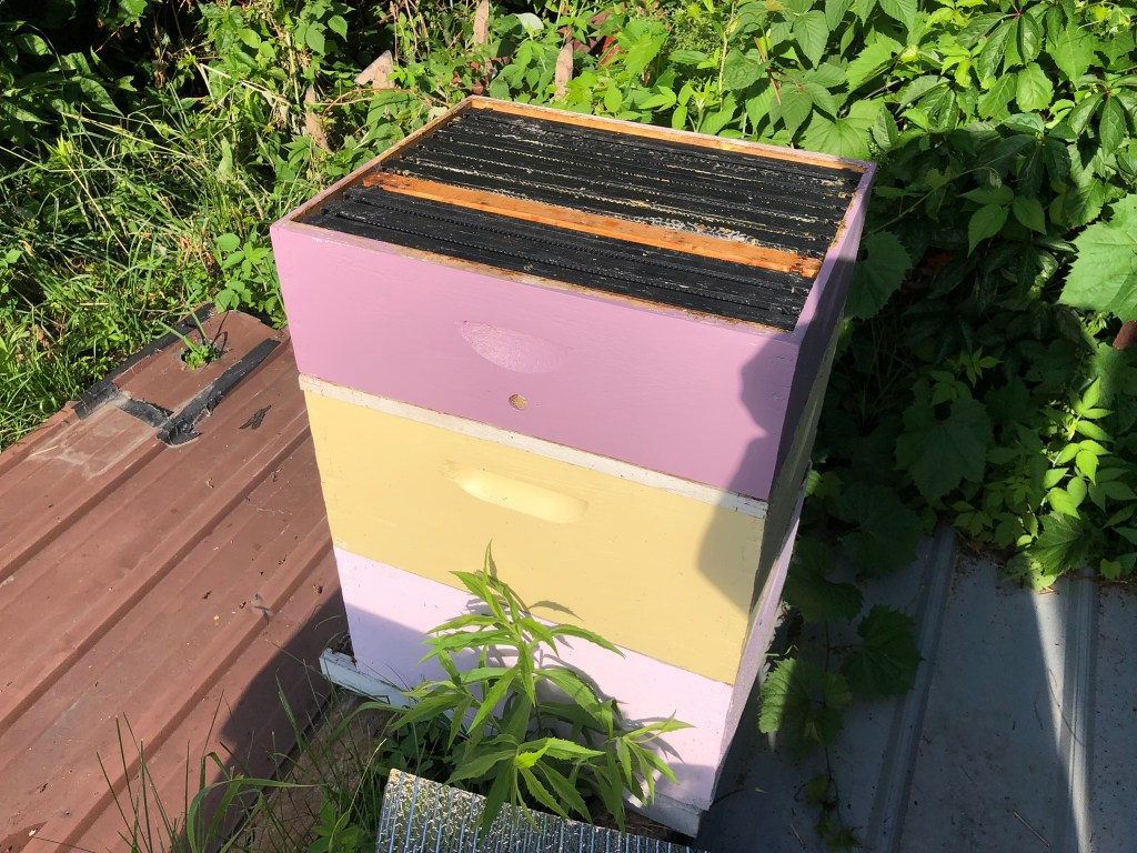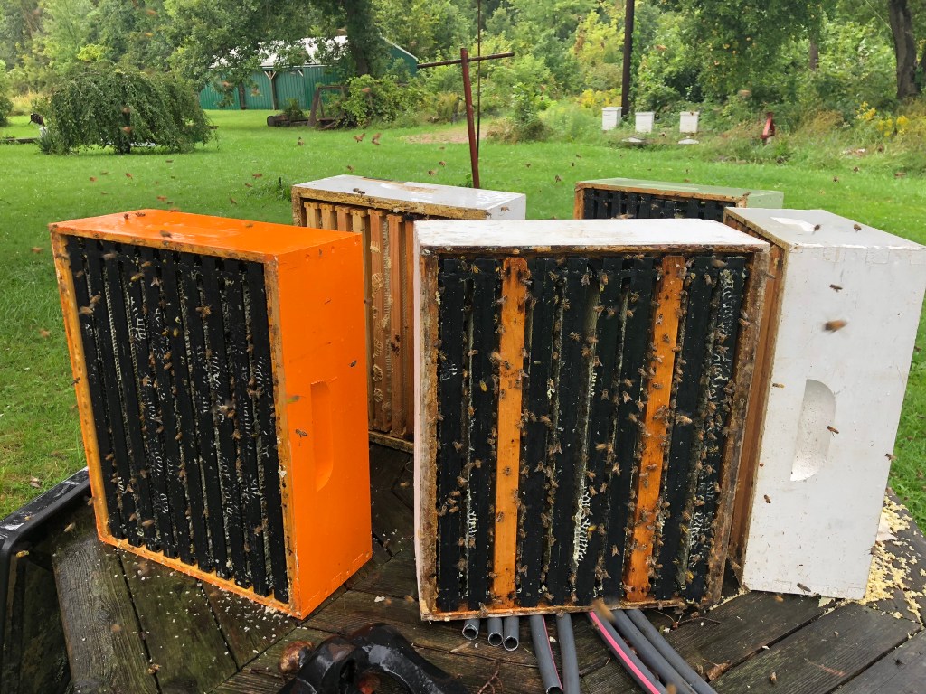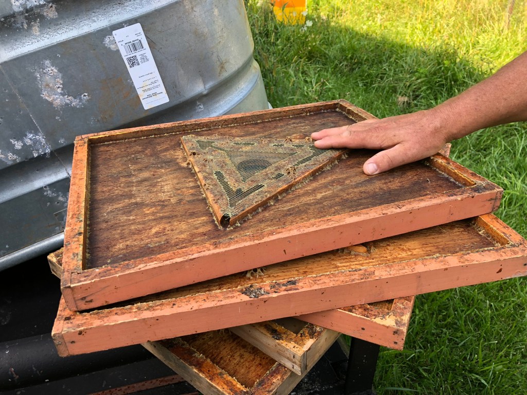 8/9 Taking all the honey supers off the hives the second week of August and giving the bees this mite treatment. This is the single most important thing to do make sure the hives will make it over the winter till spring. The mite count needs to be as low as possible BEFORE the winter bees are even eggs. This is like chemo to the hive for two weeks.