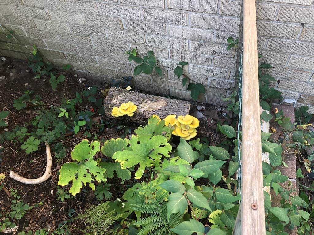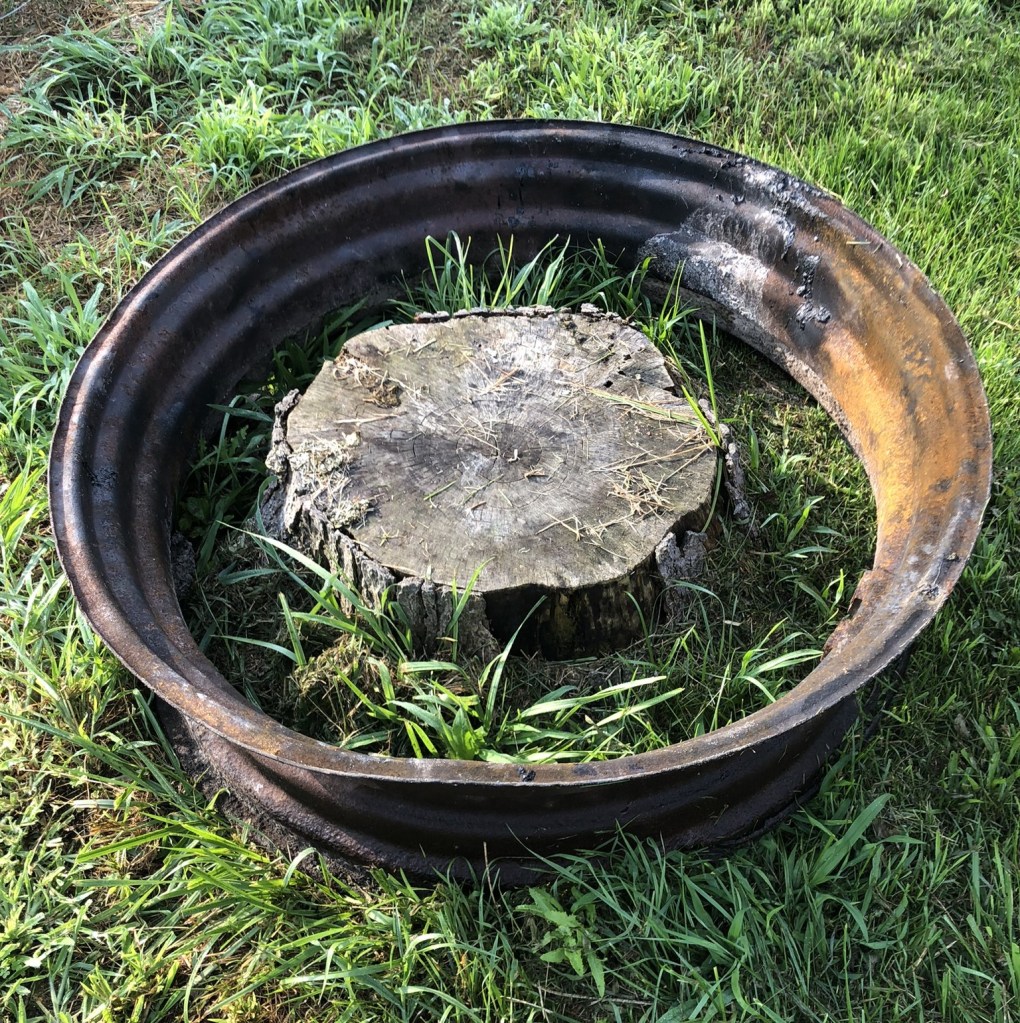 This squirrel likes to collect nuts, sit on this stump and watch chickens while it eats.