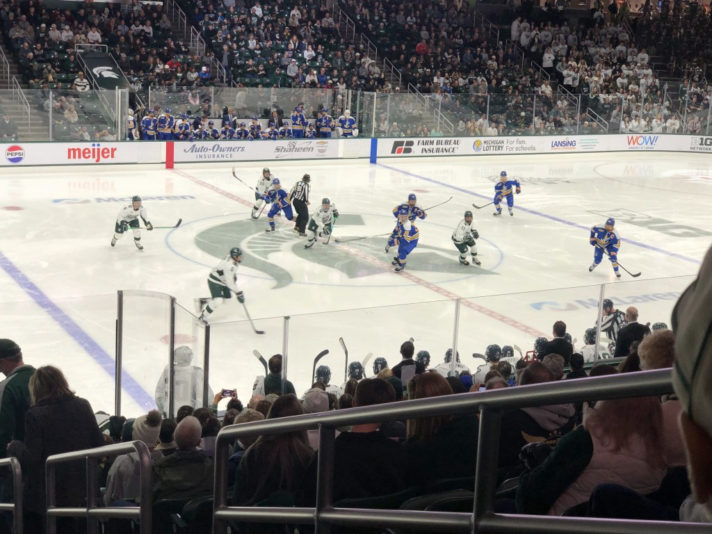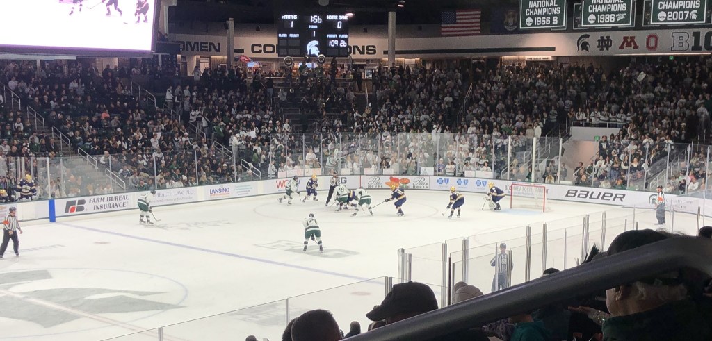 11/7 #1 Michigan State vs #3 Penn State in hockey. It was a great game with many moments that got people out of their seats. Michigan State won 2-1 in overtime the winning goal was right in front of my seats. #72 for Penn State will be the #1 draft pick next year in the NHL draft. Many many talented players in this game.