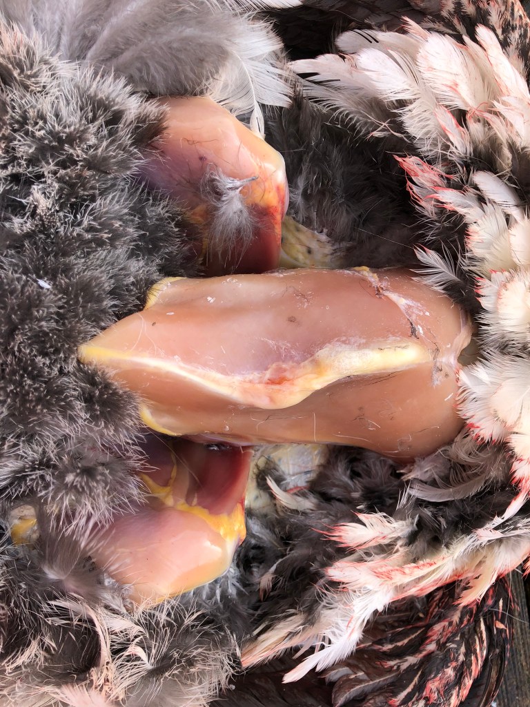 8/3 Current flock of 2 hens, 3 roosters, and 8 young birds. I have to replace “Red” the orange colored main rooster. I have butchered at least 50 of his offspring and they all have curved breast bones. One breast is bigger than the other side. One of the silver roosters will be the new rooster.