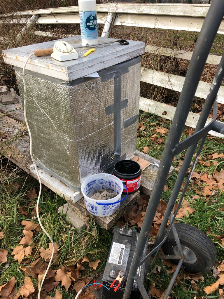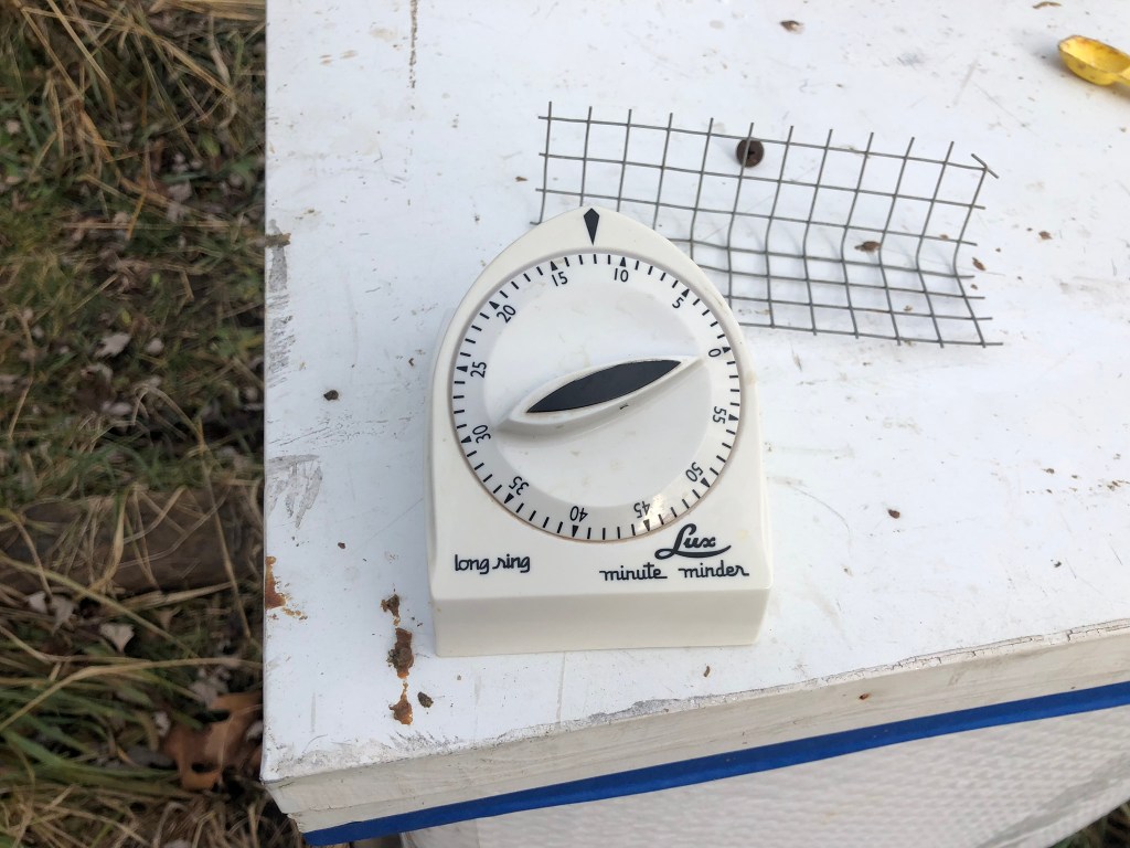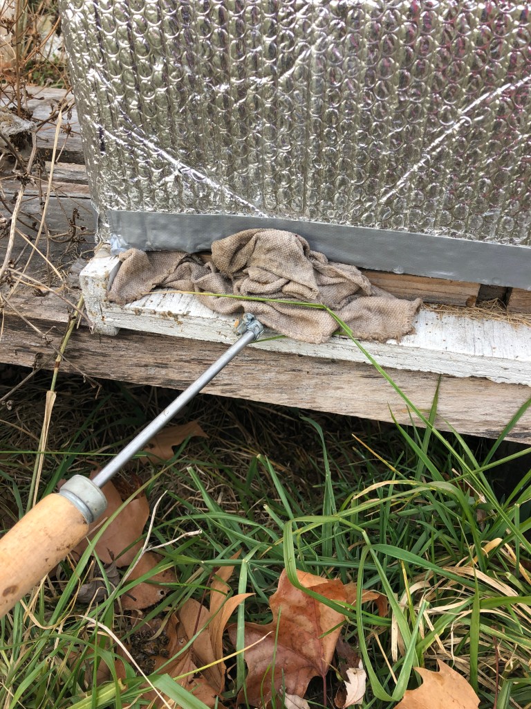 12/23 The vaporizer is heated by the battery for 2.5 minutes, the vaporizer is left in the hive unheated for 2.5 minutes and then the hive is kept closed with the wet rag for another five minutes.