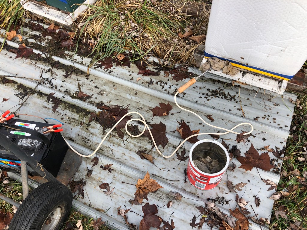 12/23 Vaporizing oxalic acid into the bee hives. This covers everything inside of the hive with crystals. The bees are forced to clean themselves and it hurts the mite’s mouth. Mites don’t really hurt honeybees, but the viruses they bring do. You want to do this on the warmest day, 10 days plus or minus from the winter solstice. The queen should be laying zero eggs and the mites cannot be protected by being in capped cells.